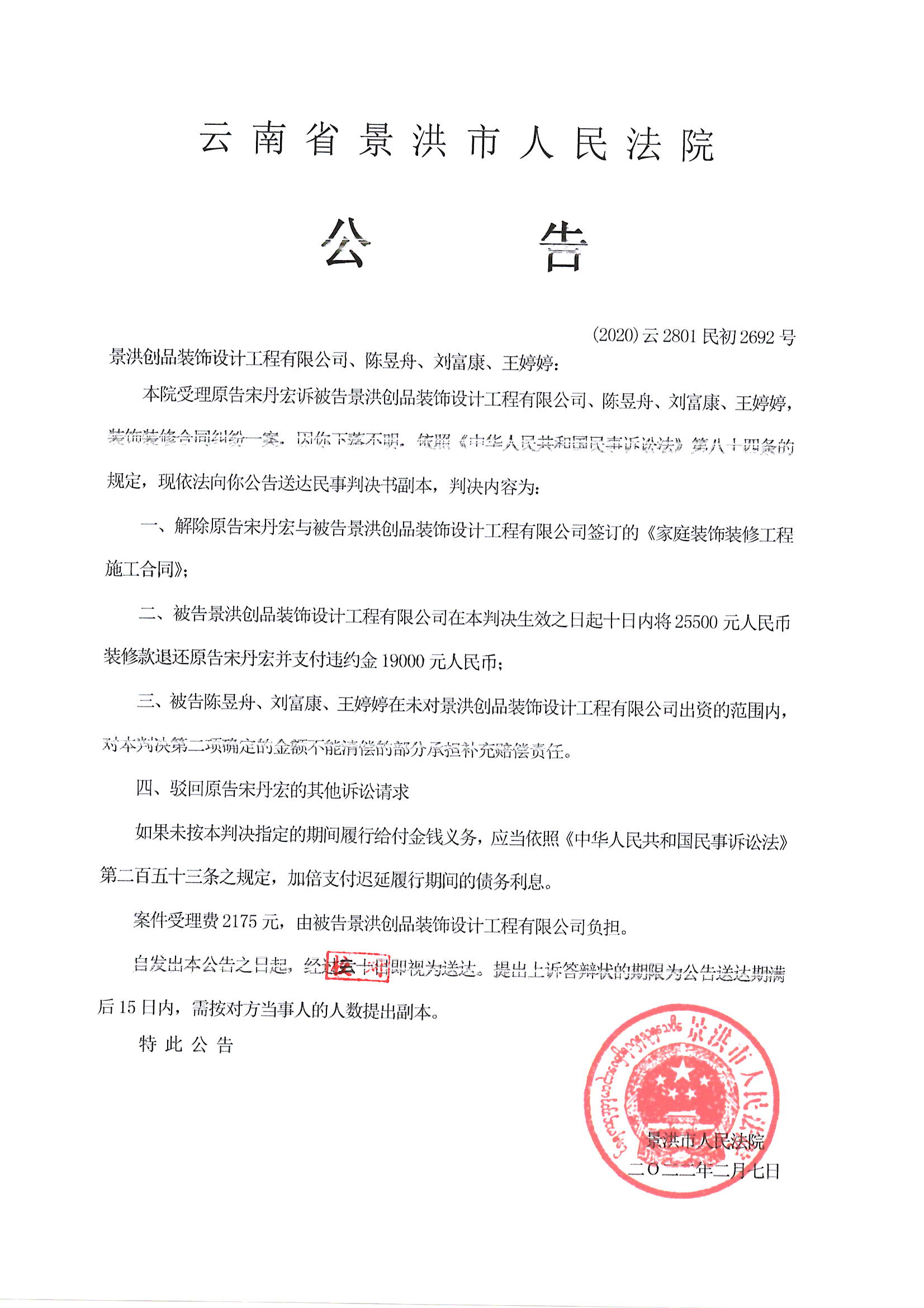 景洪创品装饰设计工程有限公司、陈昱舟、刘富康、王婷婷(2692判决公告)