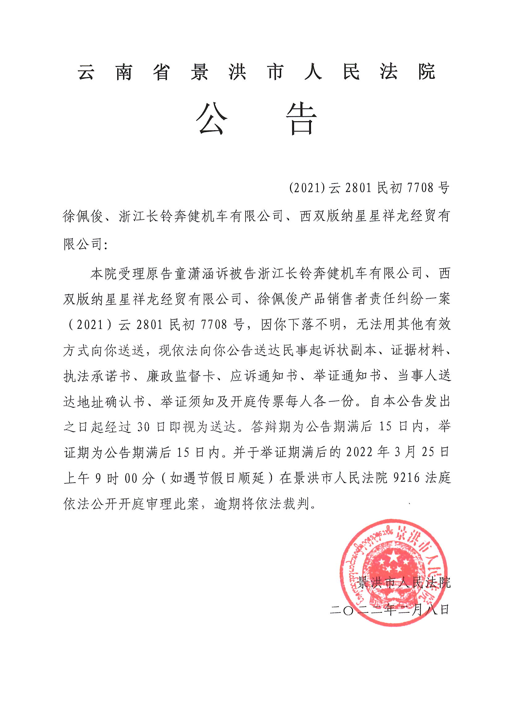 徐佩俊、浙江长铃奔健机车有限公司、西双版纳星星祥龙经贸有限公司(开庭)