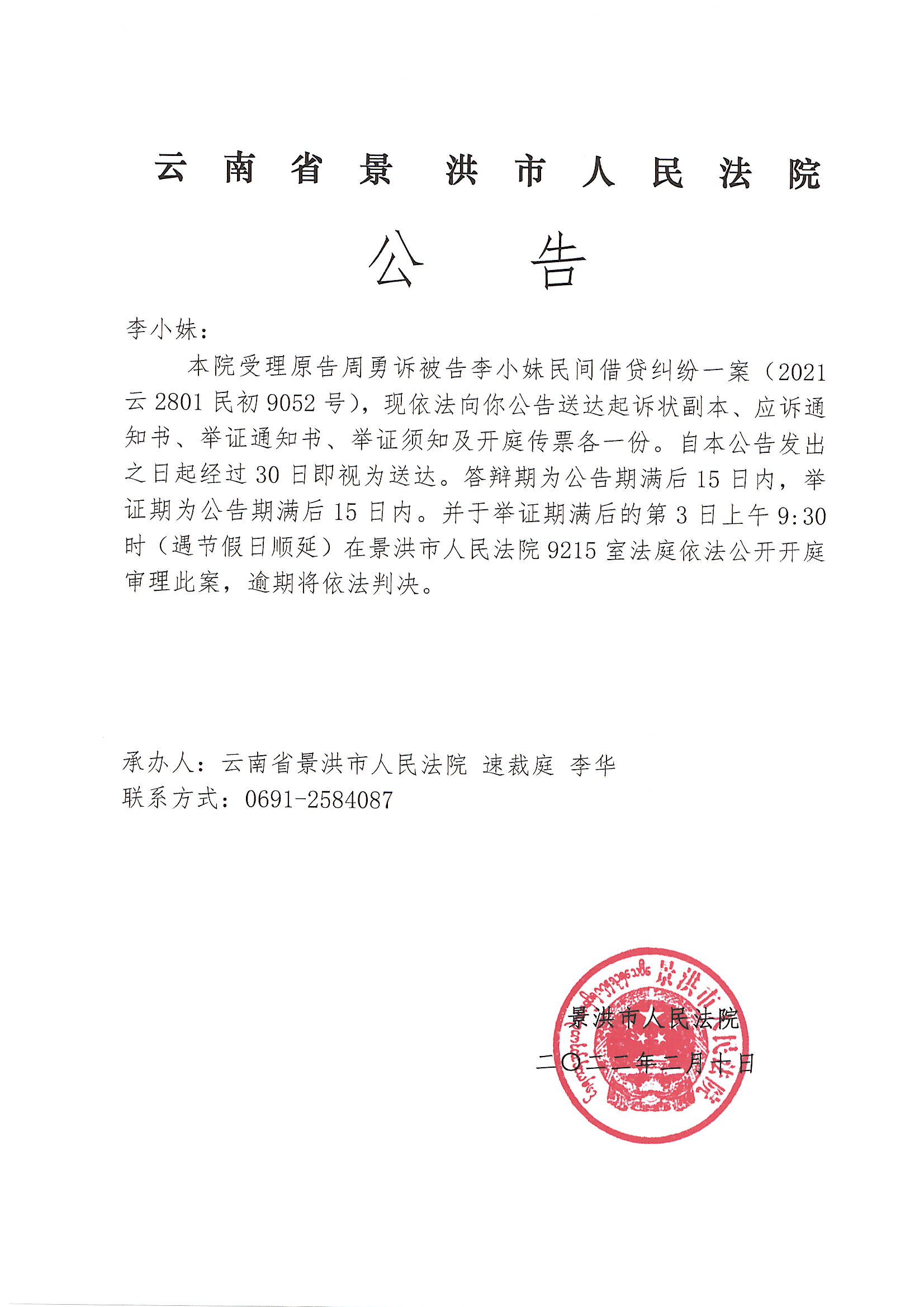 李小妹(传票公告)