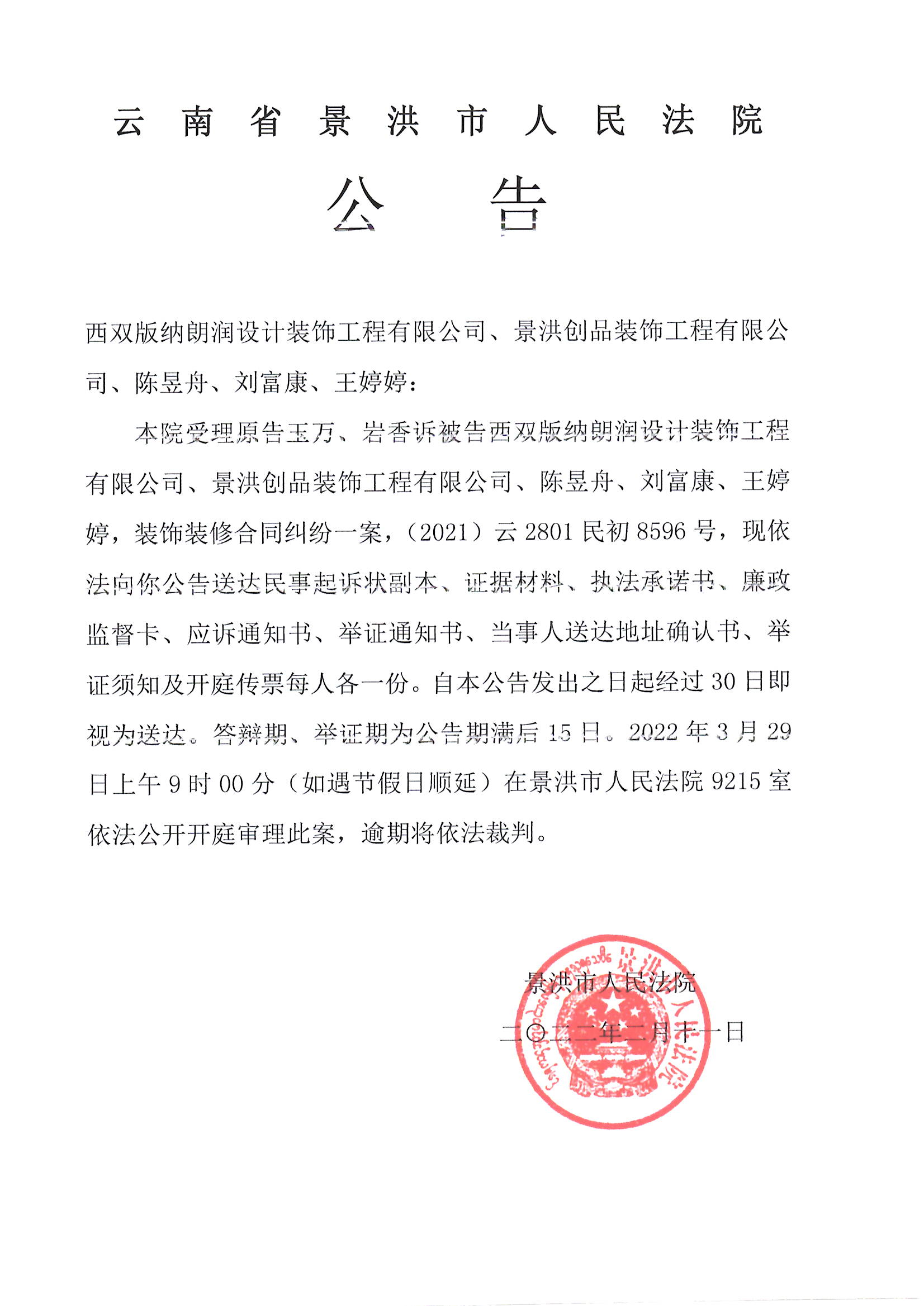 西双版纳朗润设计装饰工程有限公司、景洪创品装饰工程有限公司、陈昱舟、刘富康、王婷婷(开庭传票)