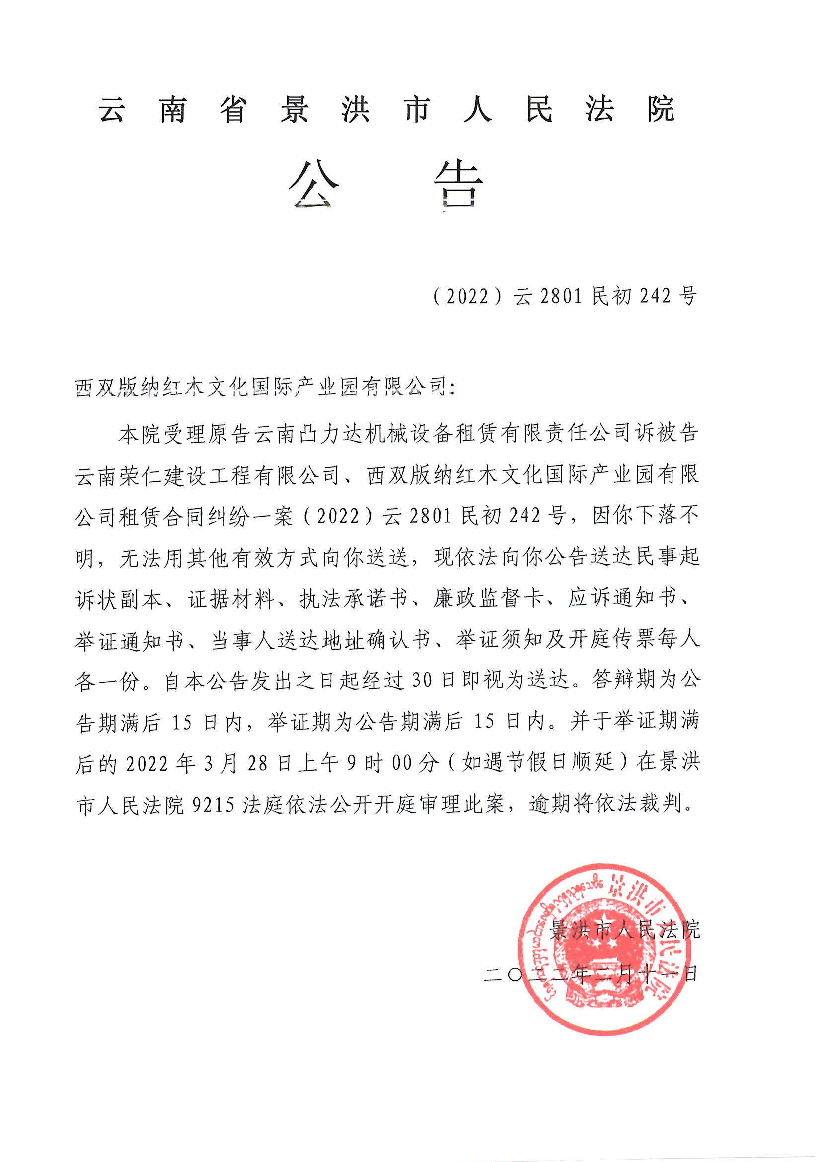 西双版纳红土文化国际产业园有限公司(开庭公告)