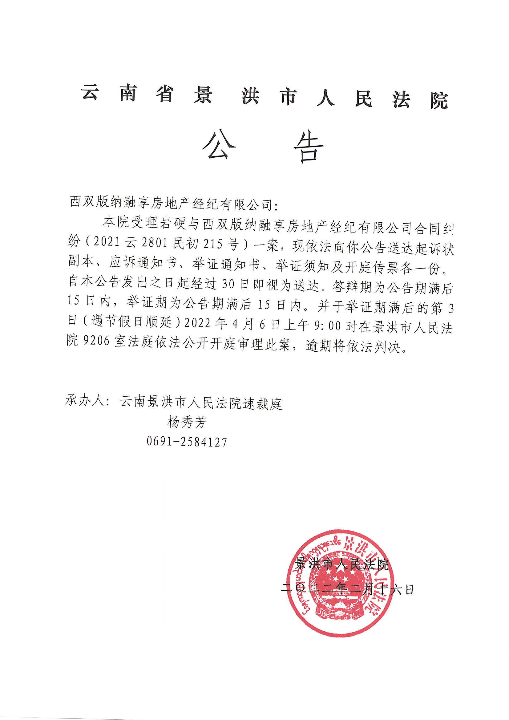 西双版纳融享房地产经纪有限公司(传票)