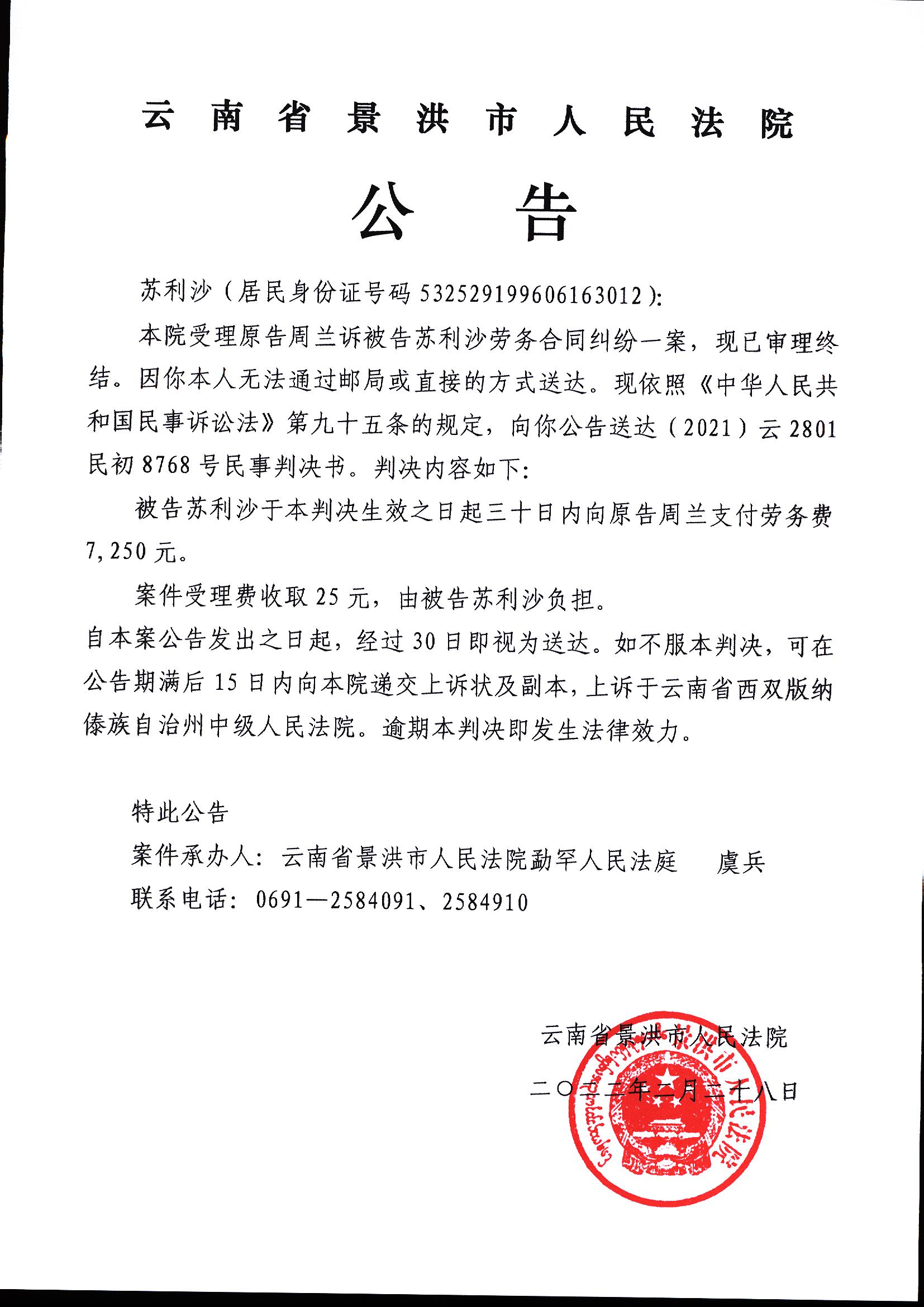 判决书公告(苏利沙8768号)