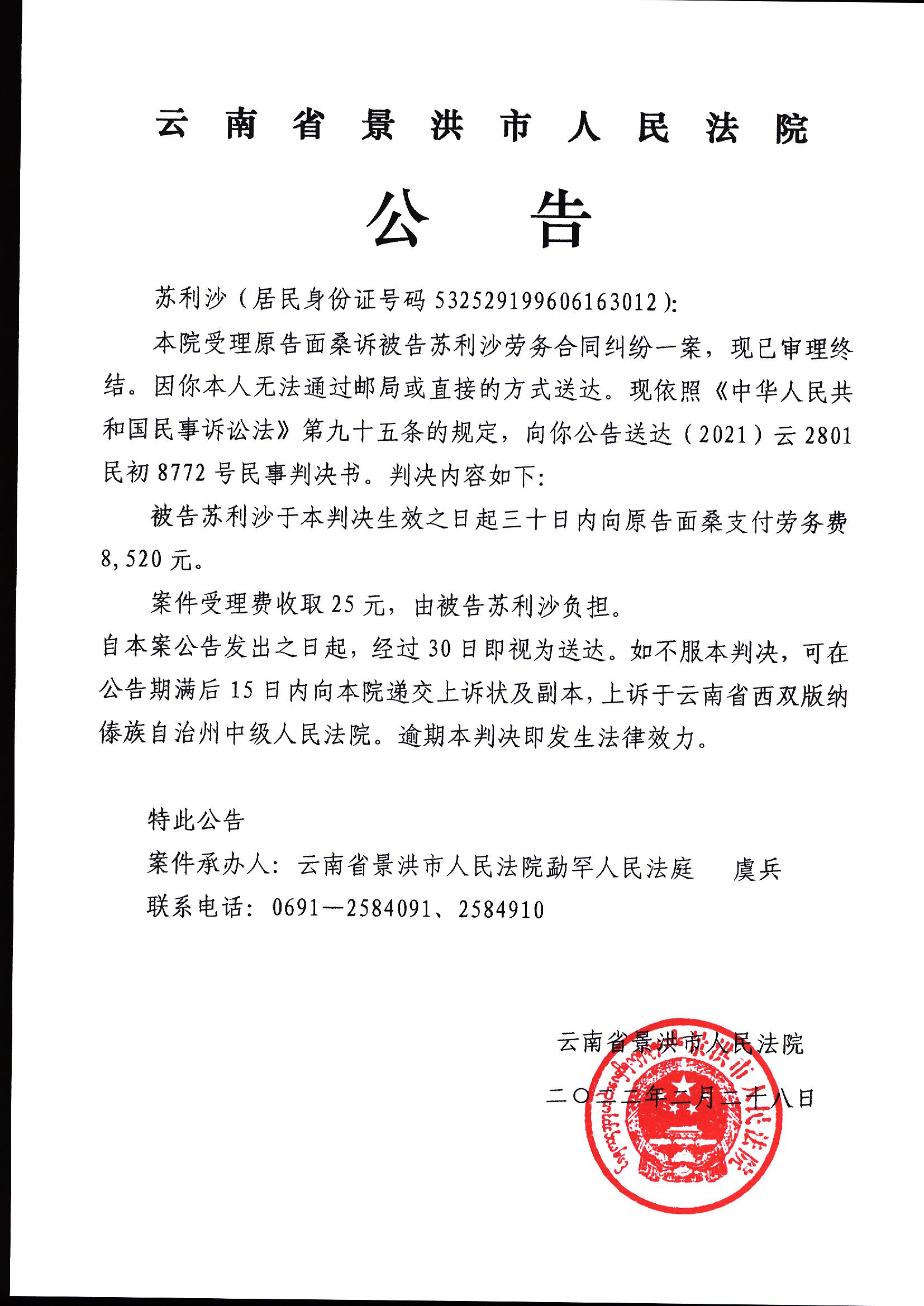 判决书公告(苏利沙8772号)