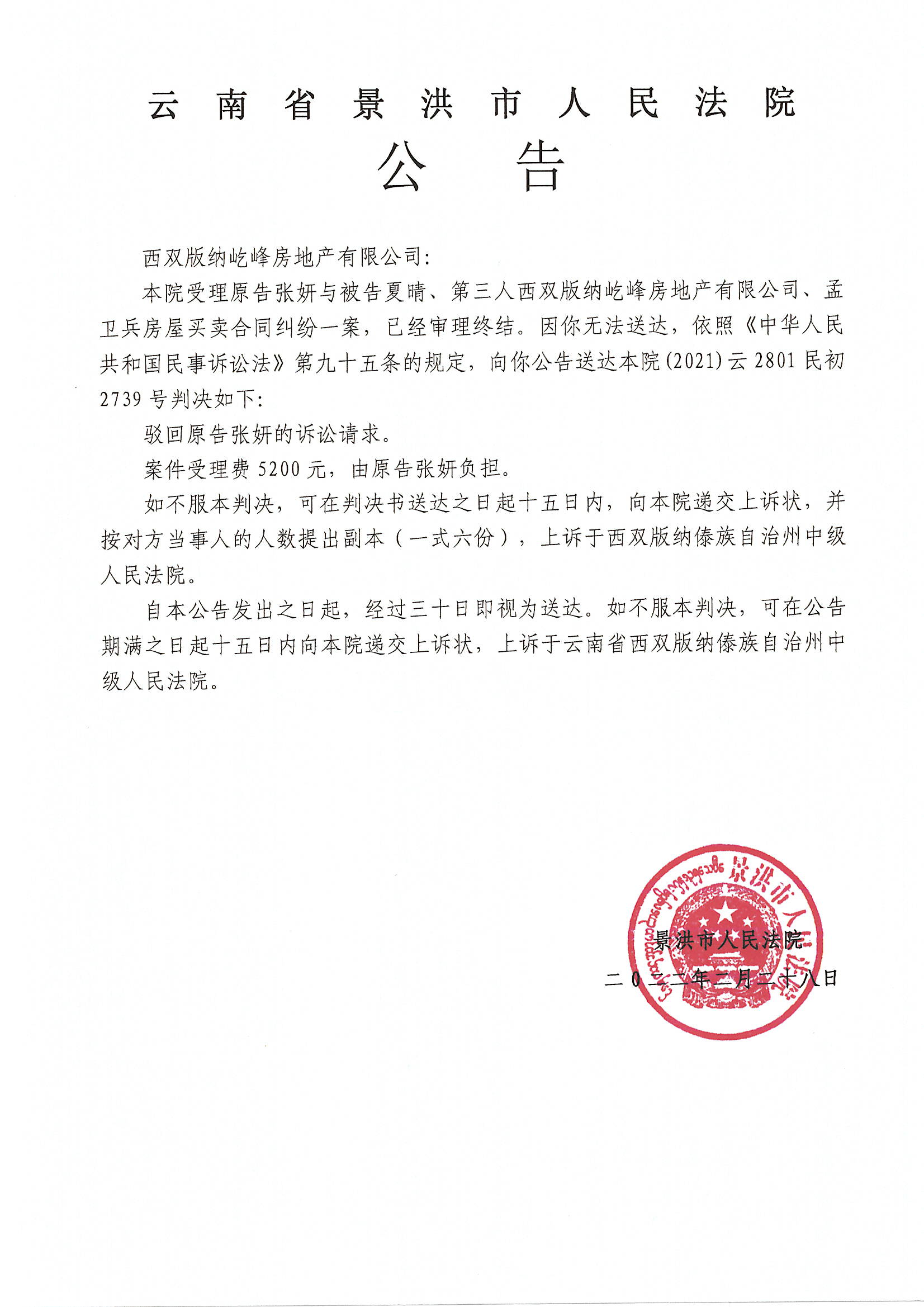 西双版纳屹峰房地产有限公司(2021云2801民初2739号判决)