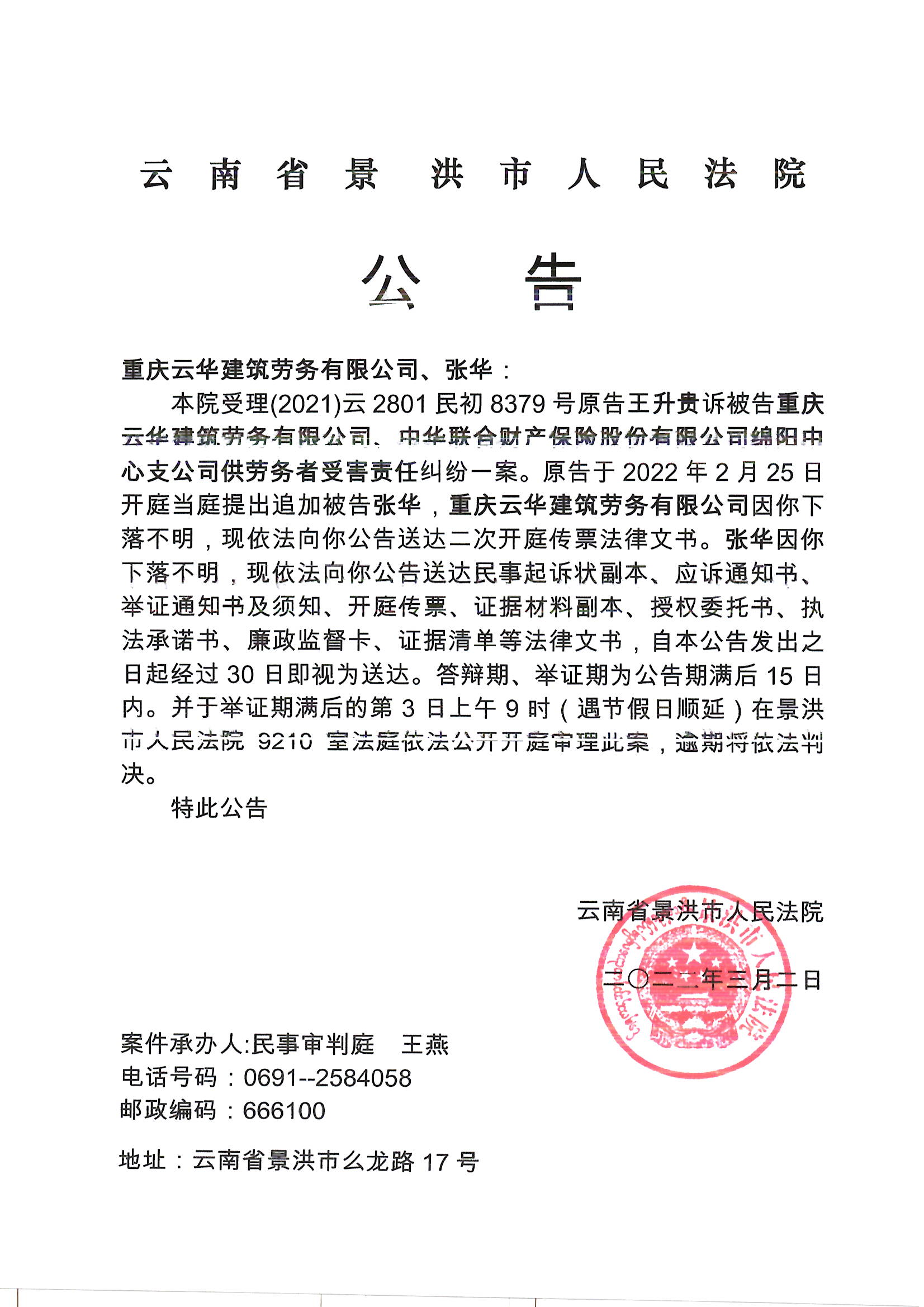 重庆云华建筑劳务有限公司、张华(二次开庭传票)