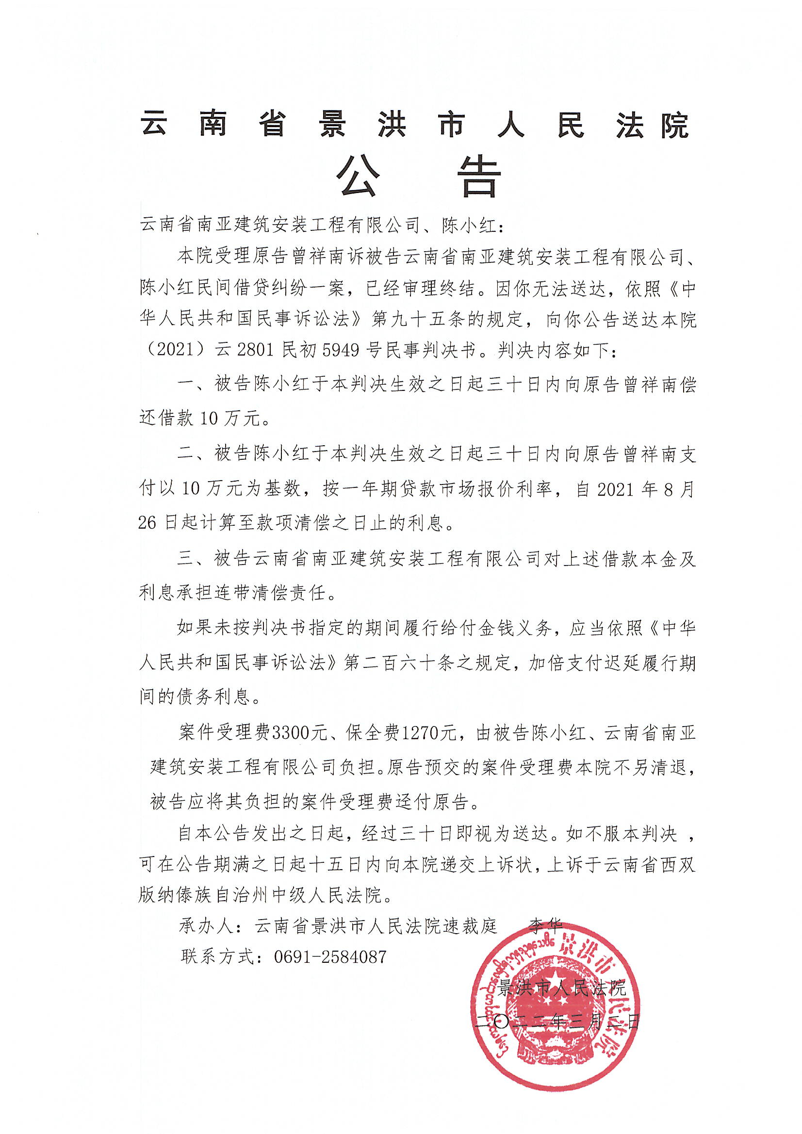 云南省南亚建筑安装工程有限公司、陈小红(判决公告*1、保全裁定公告*2)