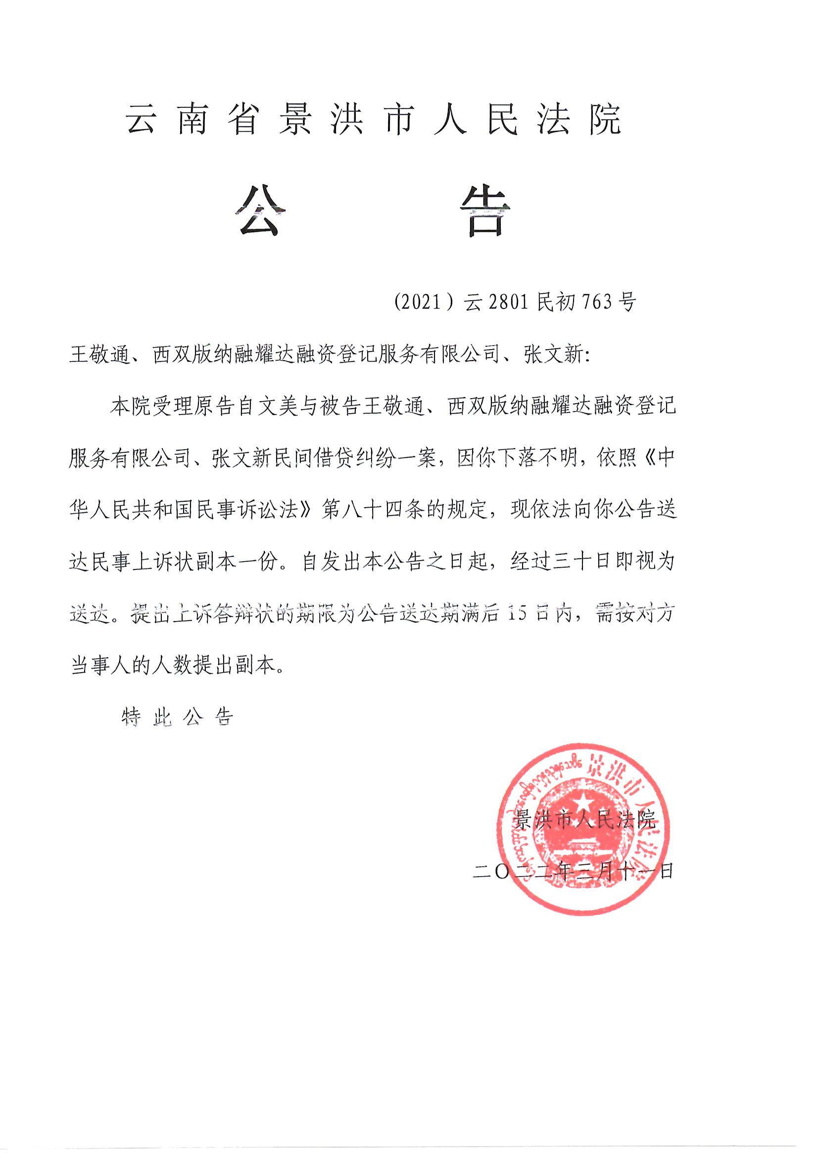 王敬通、西双版纳融耀达融资登记服务有限公司、张文新(上诉公告)
