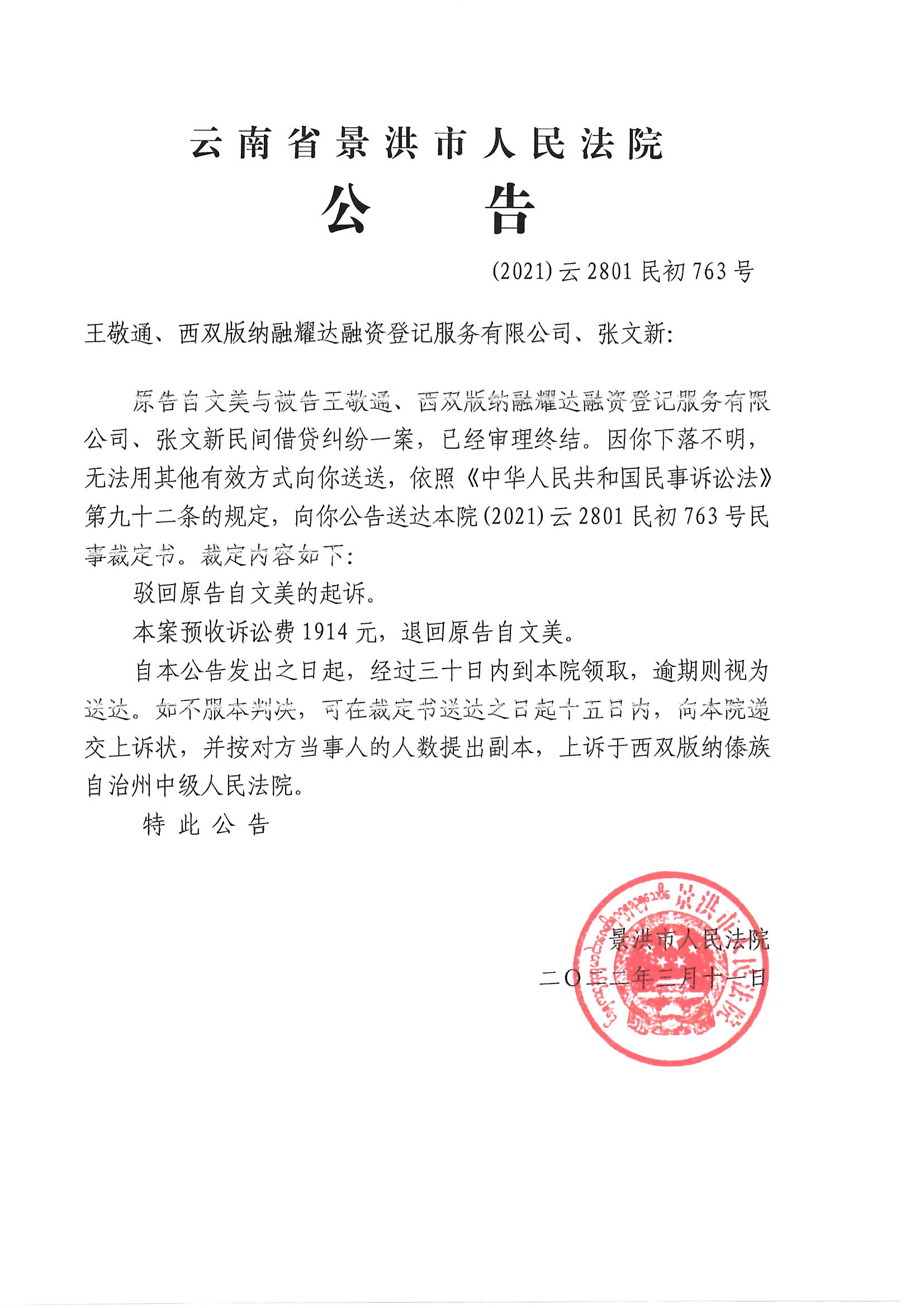 王敬通、西双版纳融耀达融资登记服务有限公司、张文新(裁定公告)