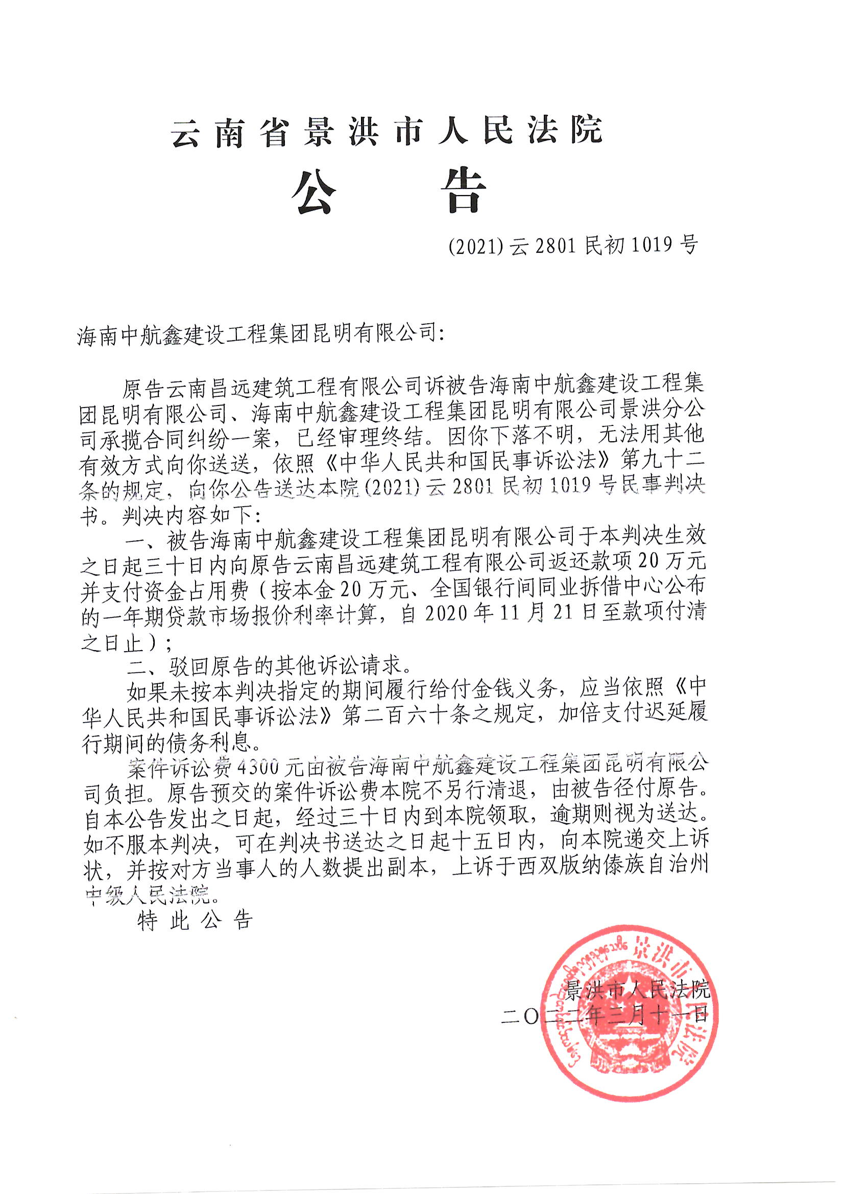海南中航鑫建设工程集团昆明有限公司(判决公告)