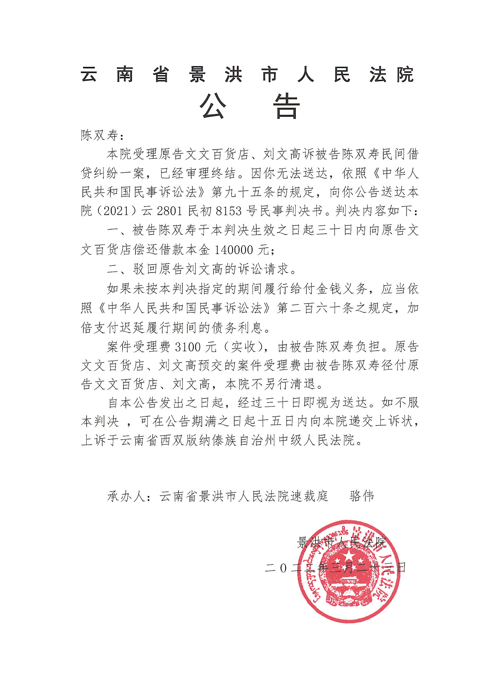 陈双寿(民初8153号判决公告)