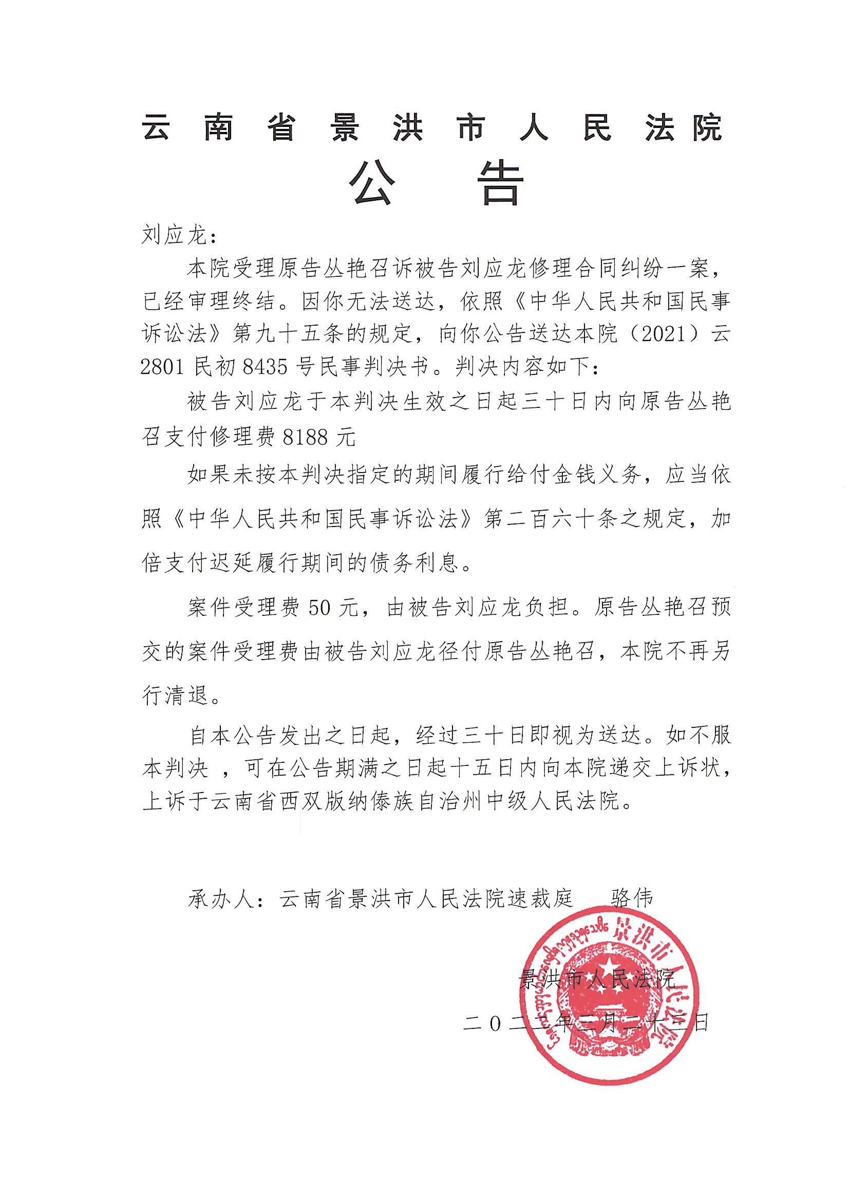刘应龙(民初8435号判决公告)