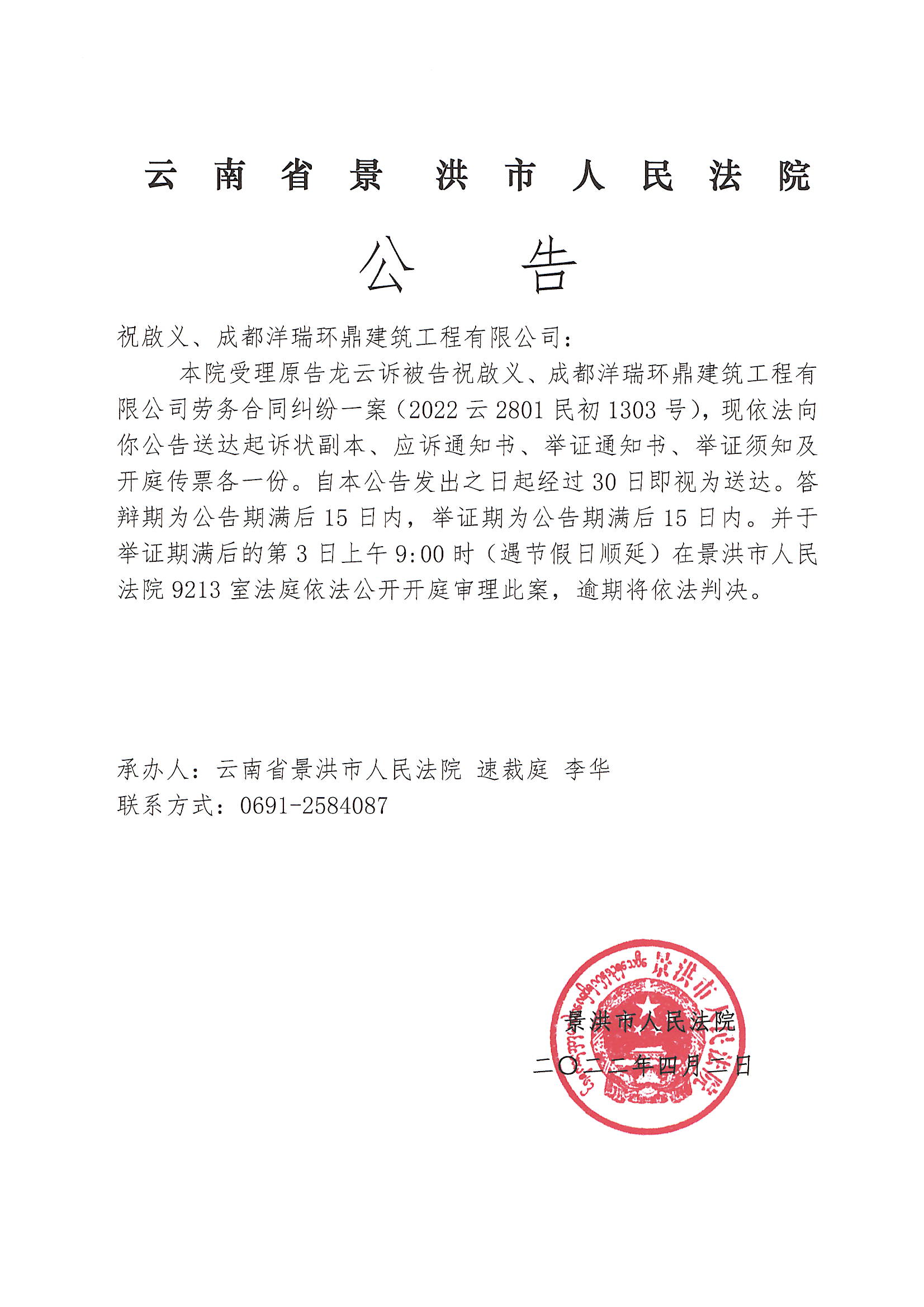 祝啟义、成都洋瑞环鼎建筑工程有限公司(传票公告)