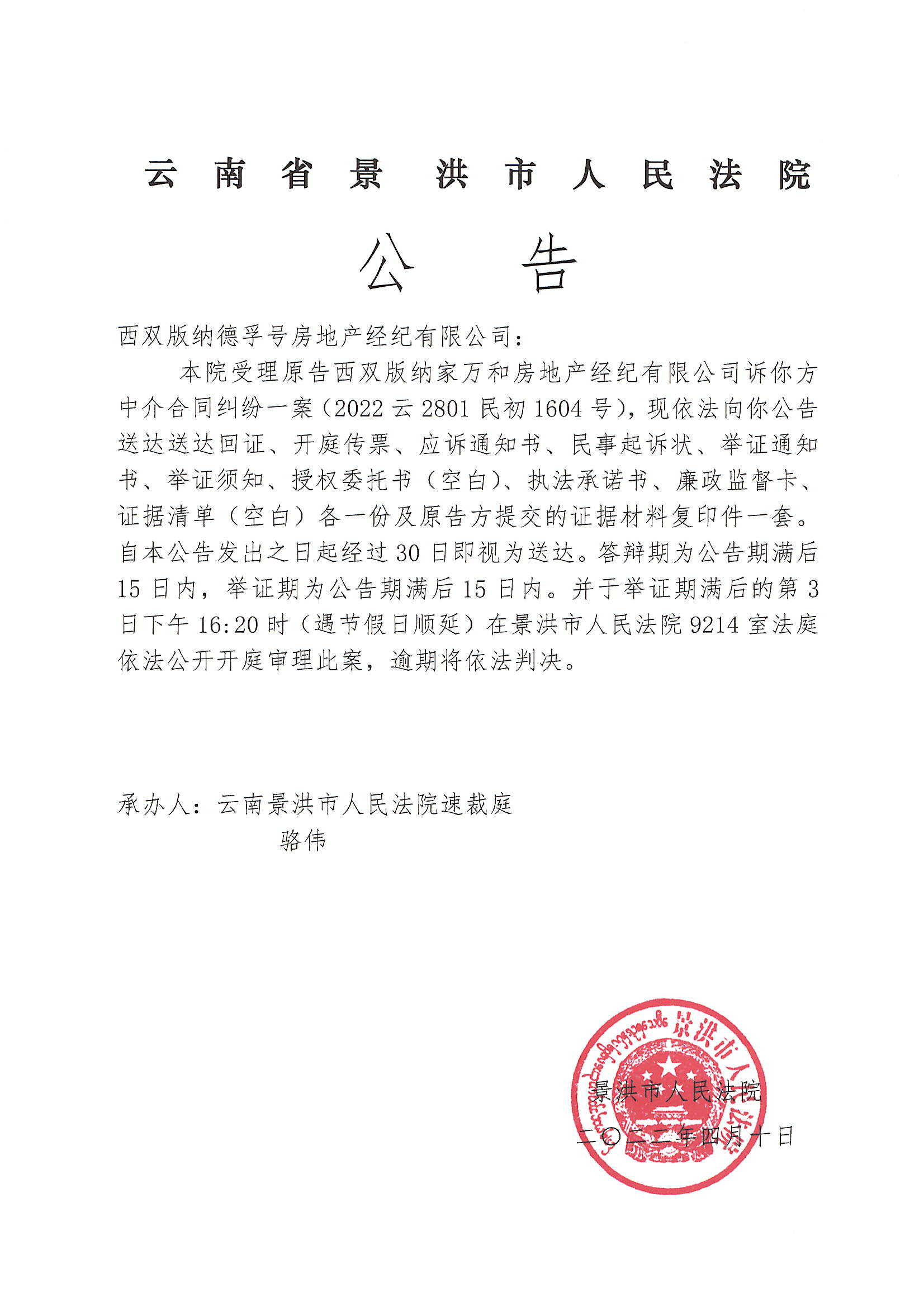 西双版纳德孚号房地产经纪有限公司(传票公告)