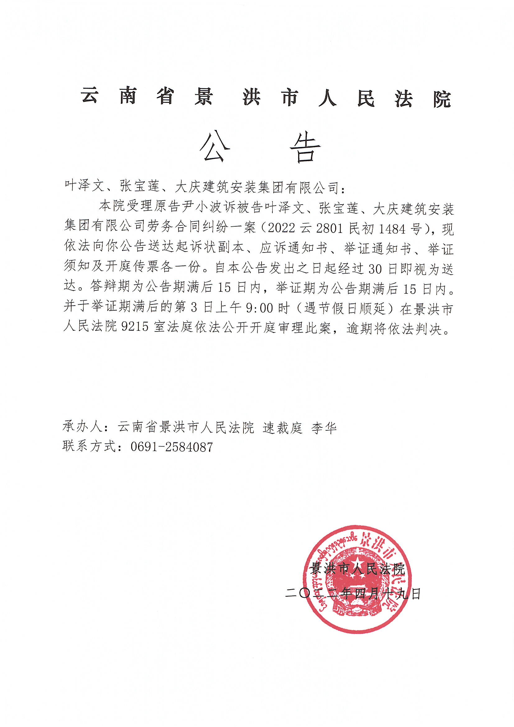 叶泽文、张宝莲、大庆建筑安装集团有限公司(1484号传票公告)