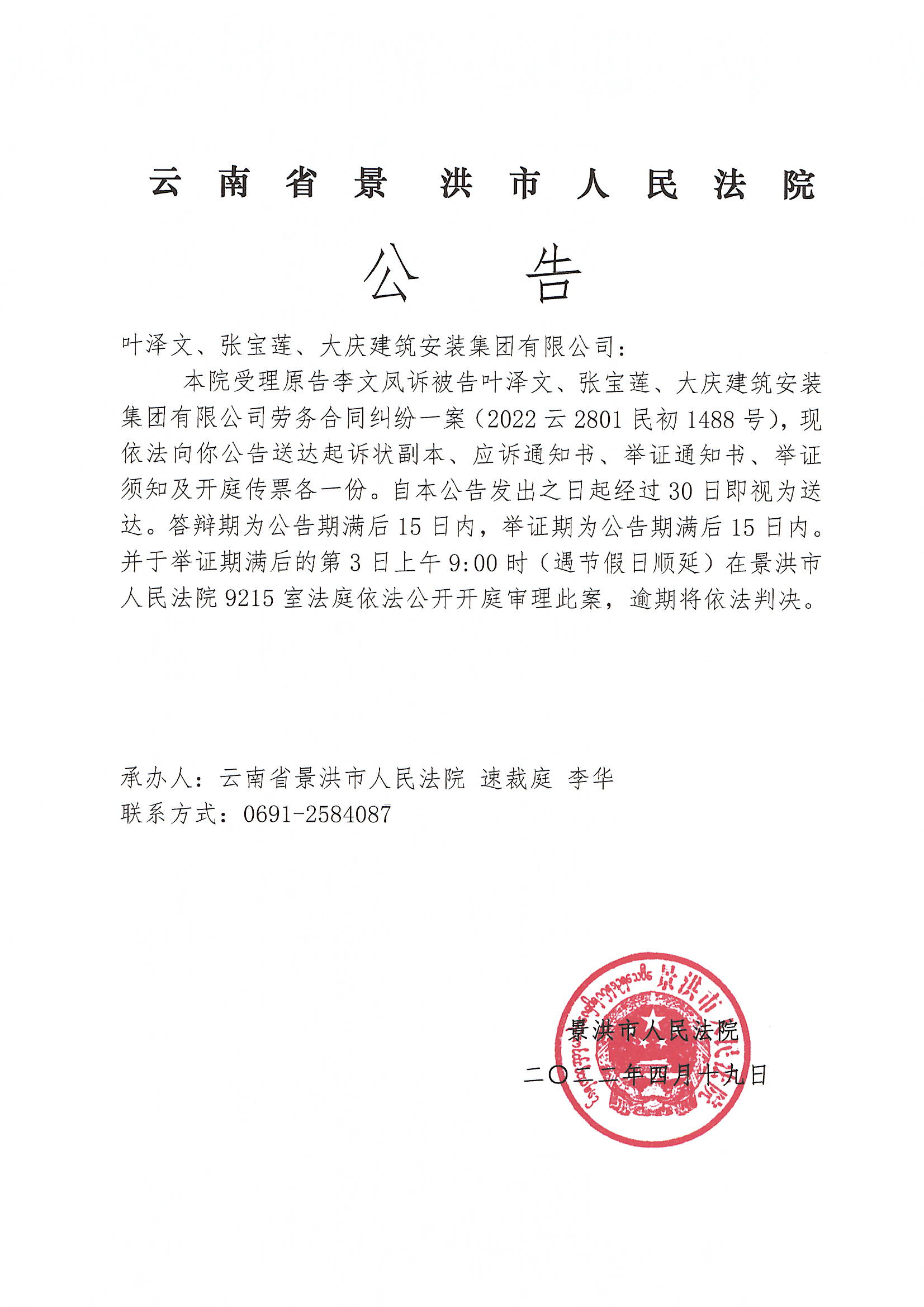 叶泽文、张宝莲、大庆建筑安装集团有限公司(1488号传票公告)