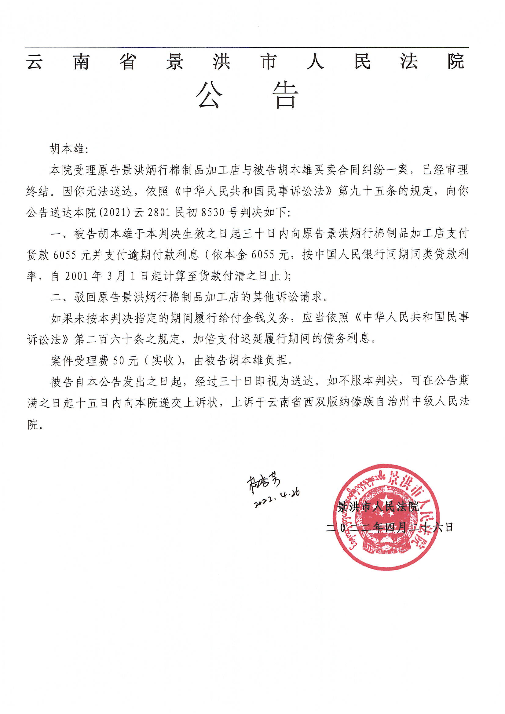 胡本雄(判决公告)