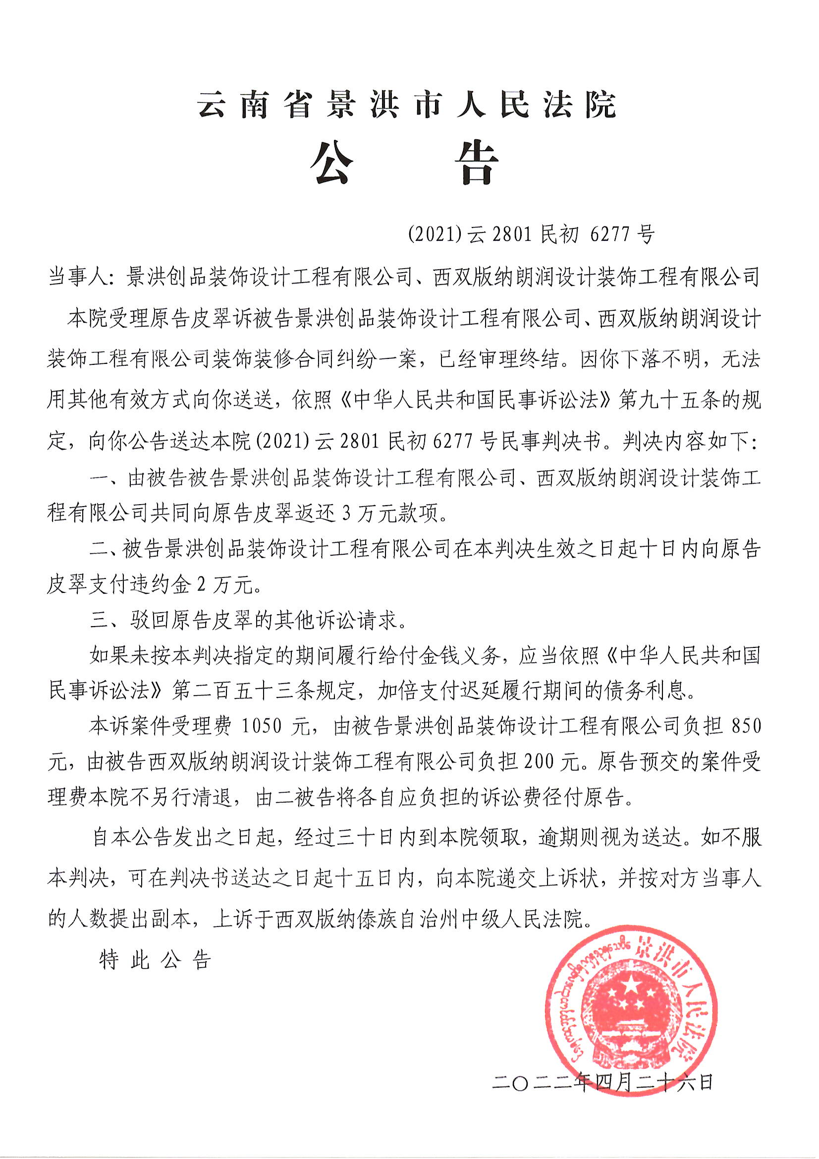 景洪创品装饰设计工程有限公司、西双版纳朗润设计装饰工程有限公司(判决)