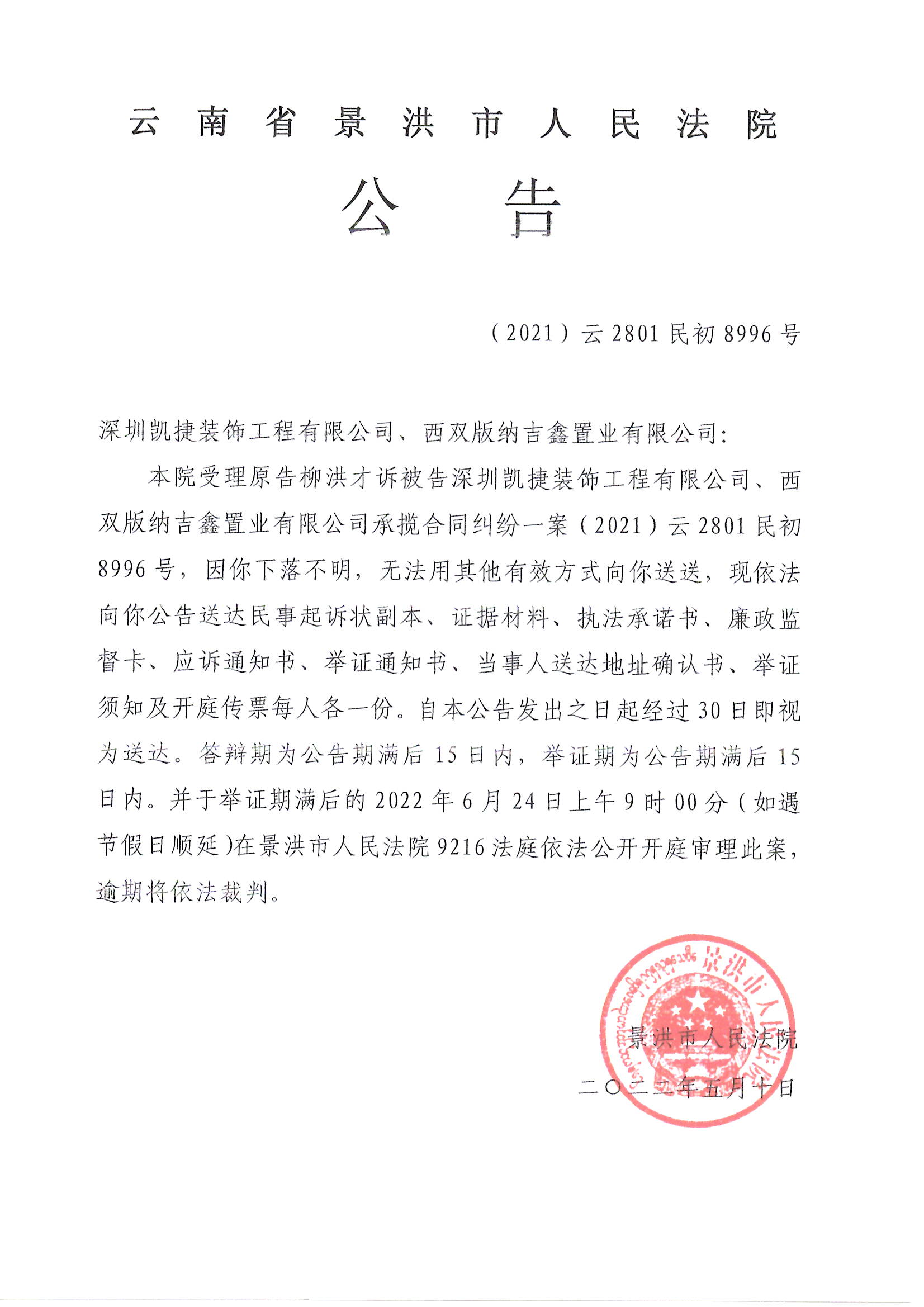 深圳凯捷装饰工程有限公司、西双版纳吉鑫置业有限公司(开庭公告)