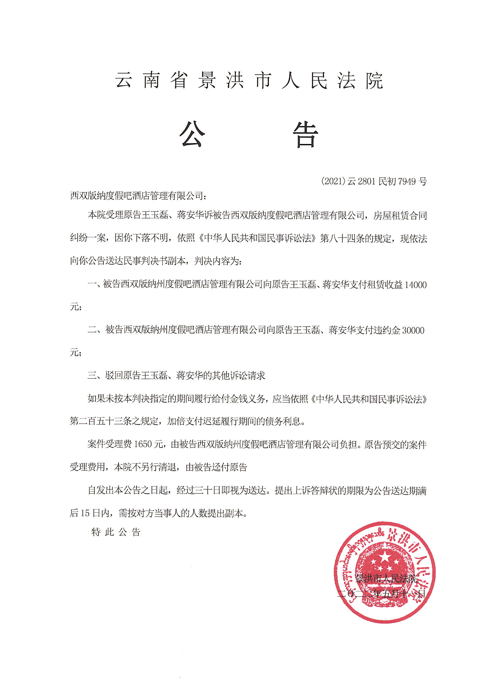西双版纳度假吧酒店管理有限公司(判决公告)