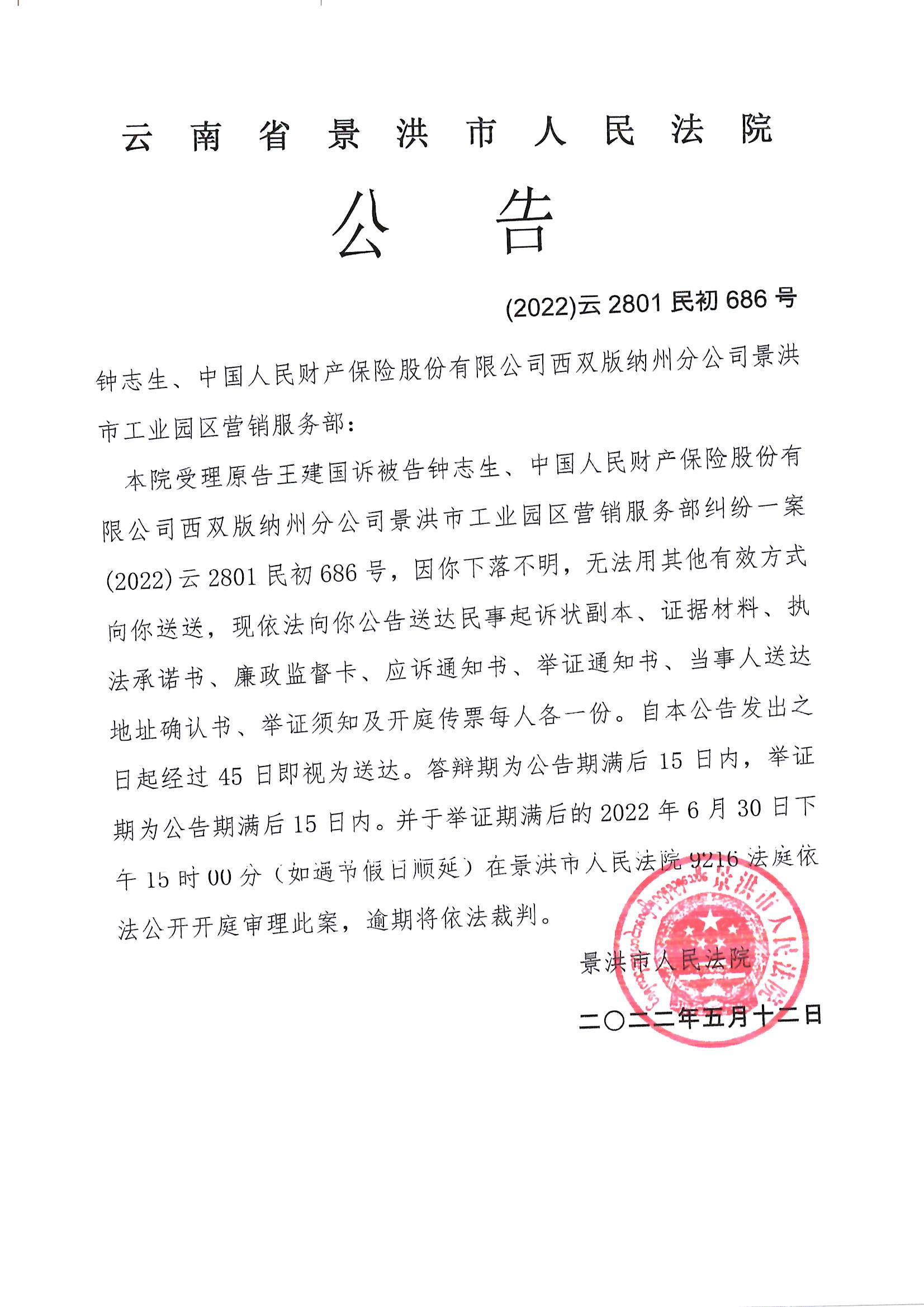 钟志生、中国人民财产保险股份有限公司西双版纳州分公司景洪市工业园区营销服务部(开庭公告)
