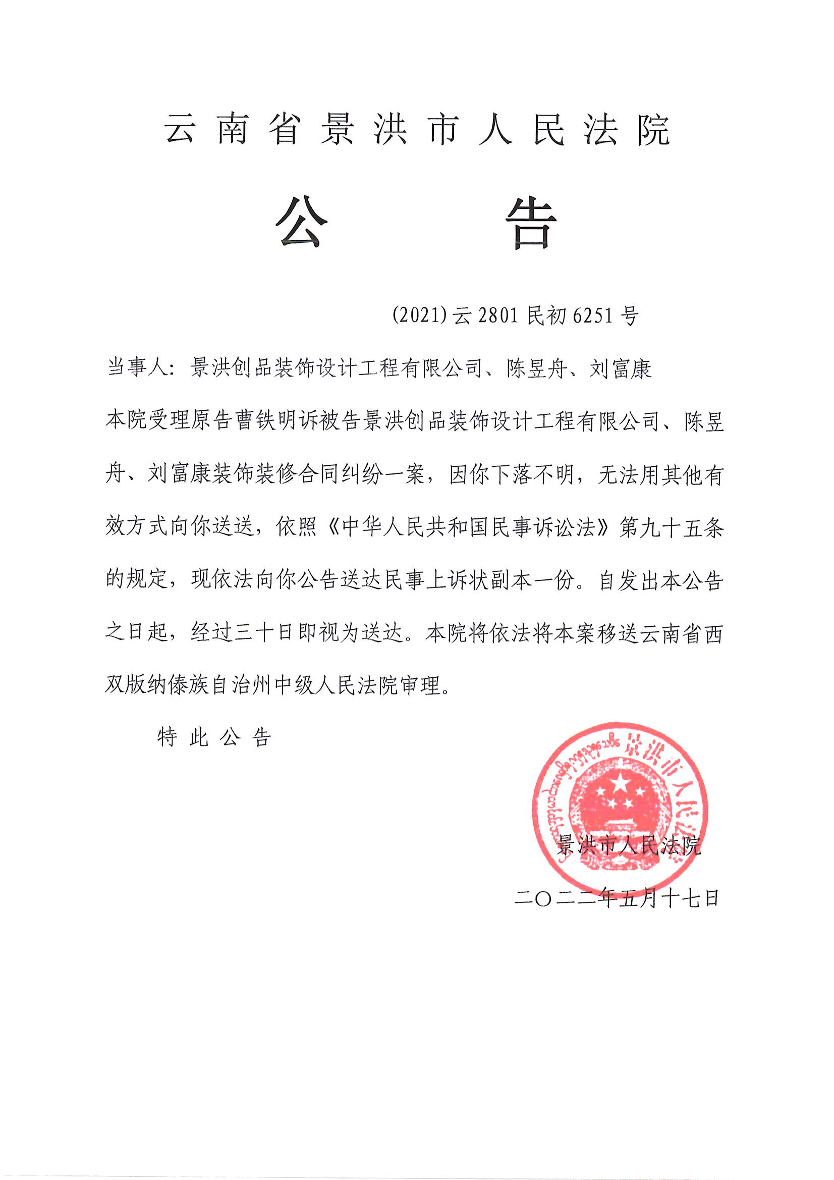 景洪创品装饰设计工程有限公司、陈昱舟、刘富康(上诉)