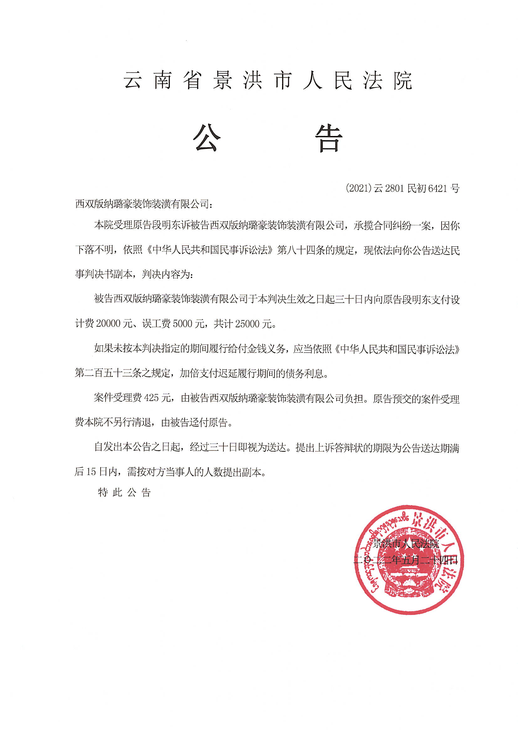 西双版纳璐豪装饰装潢有限公司(6421判决公告)