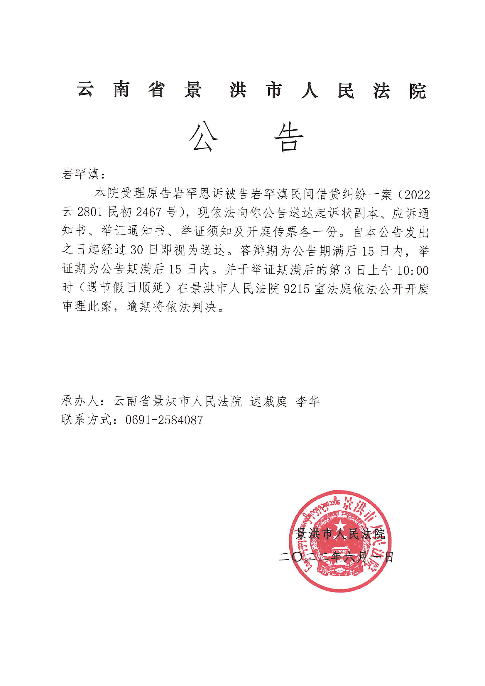 岩罕滇(传票公告)