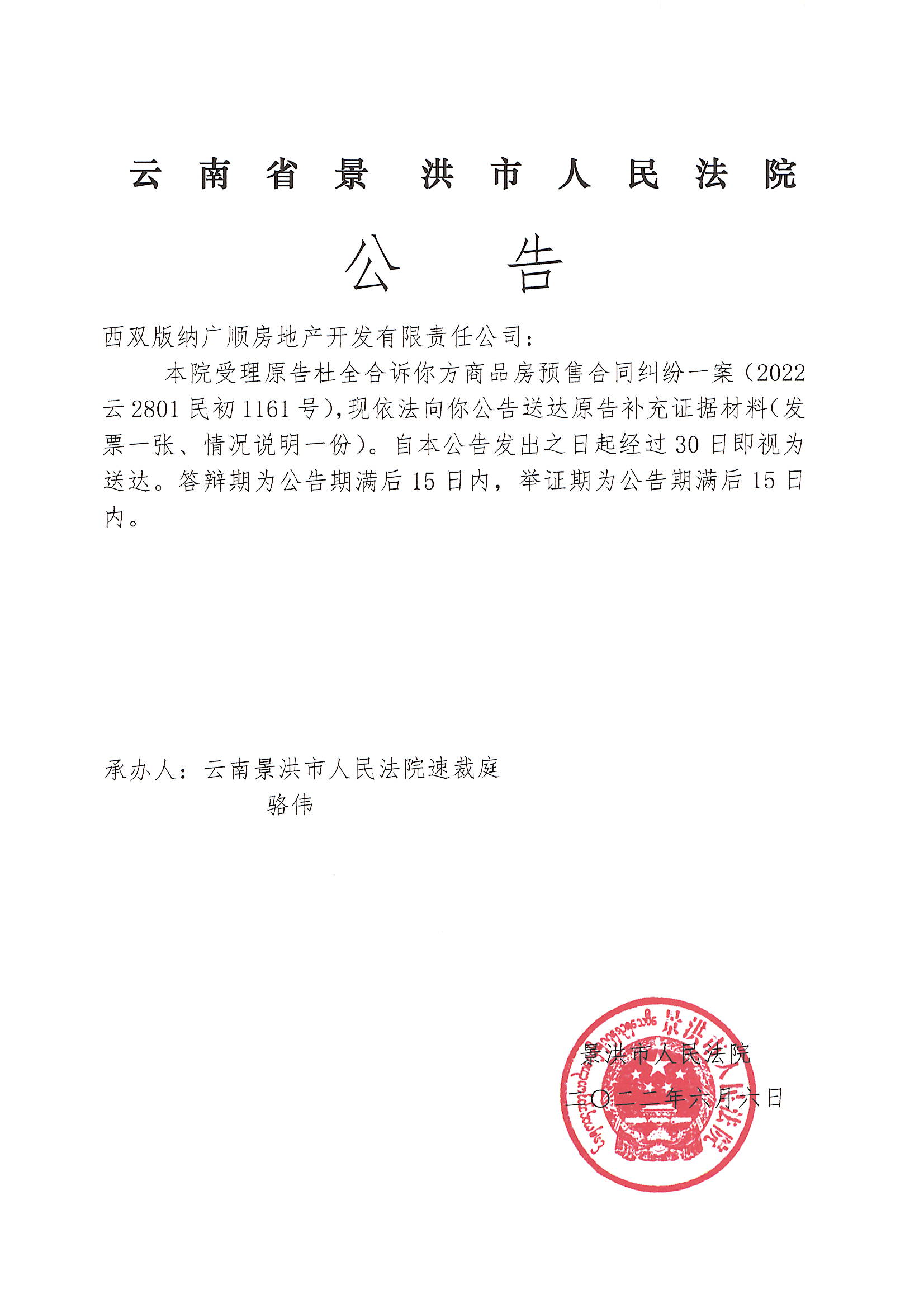 西双版纳广顺房地产开发有限责任公司(证据公告)