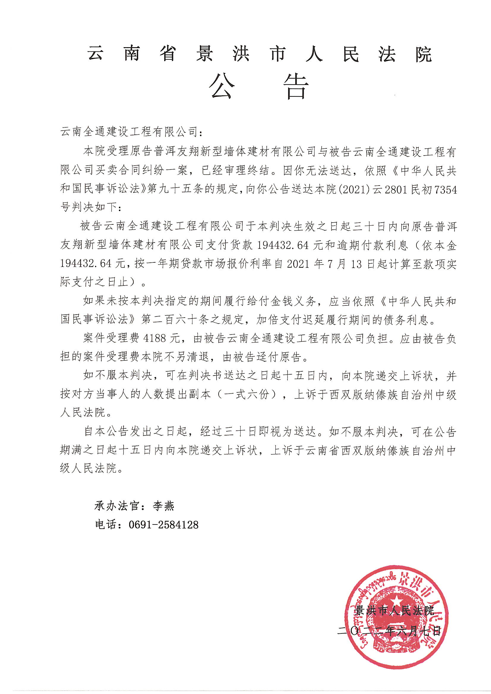 云南全通建设工程有限公司(判决公告)