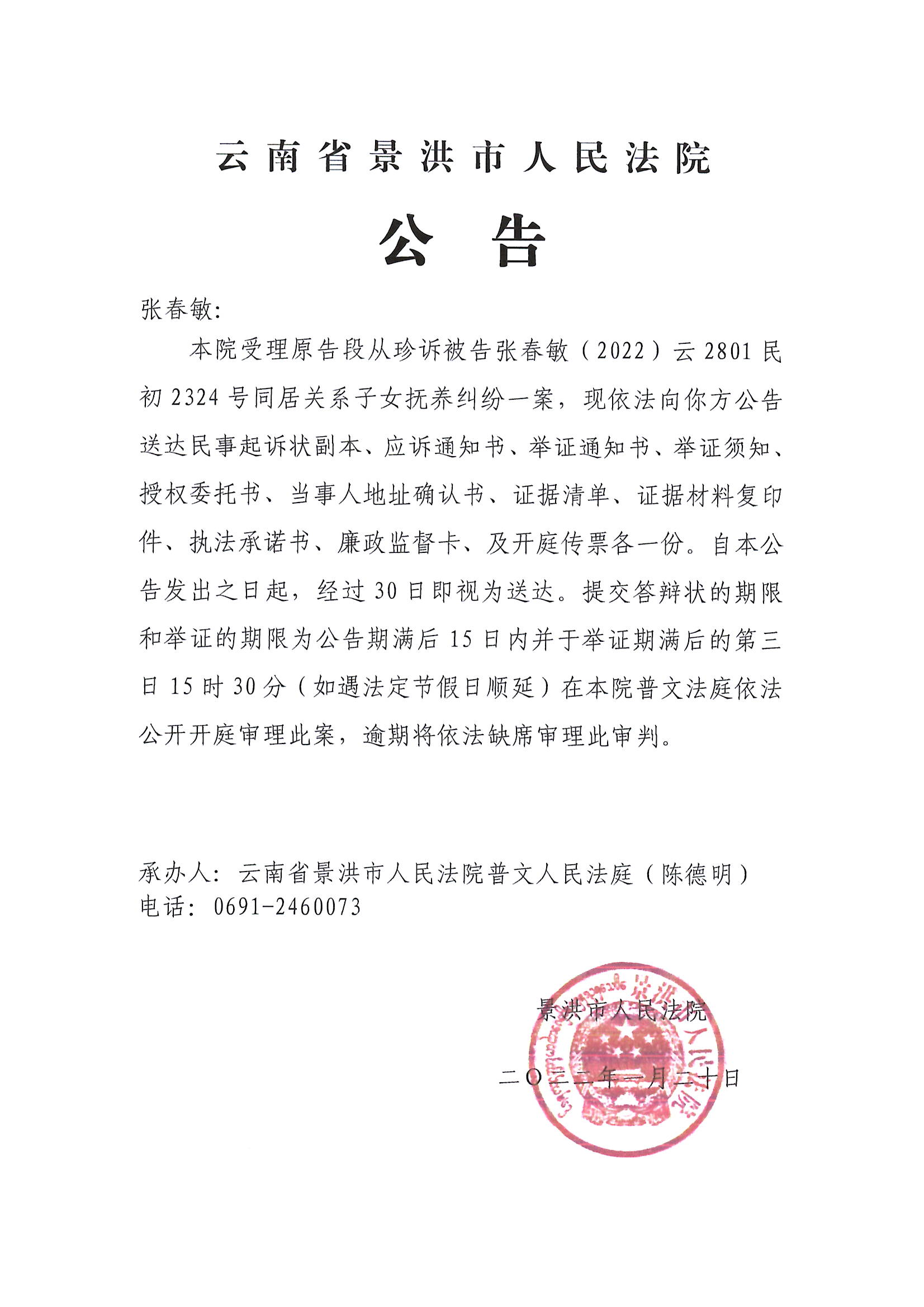 张春敏传票公告
