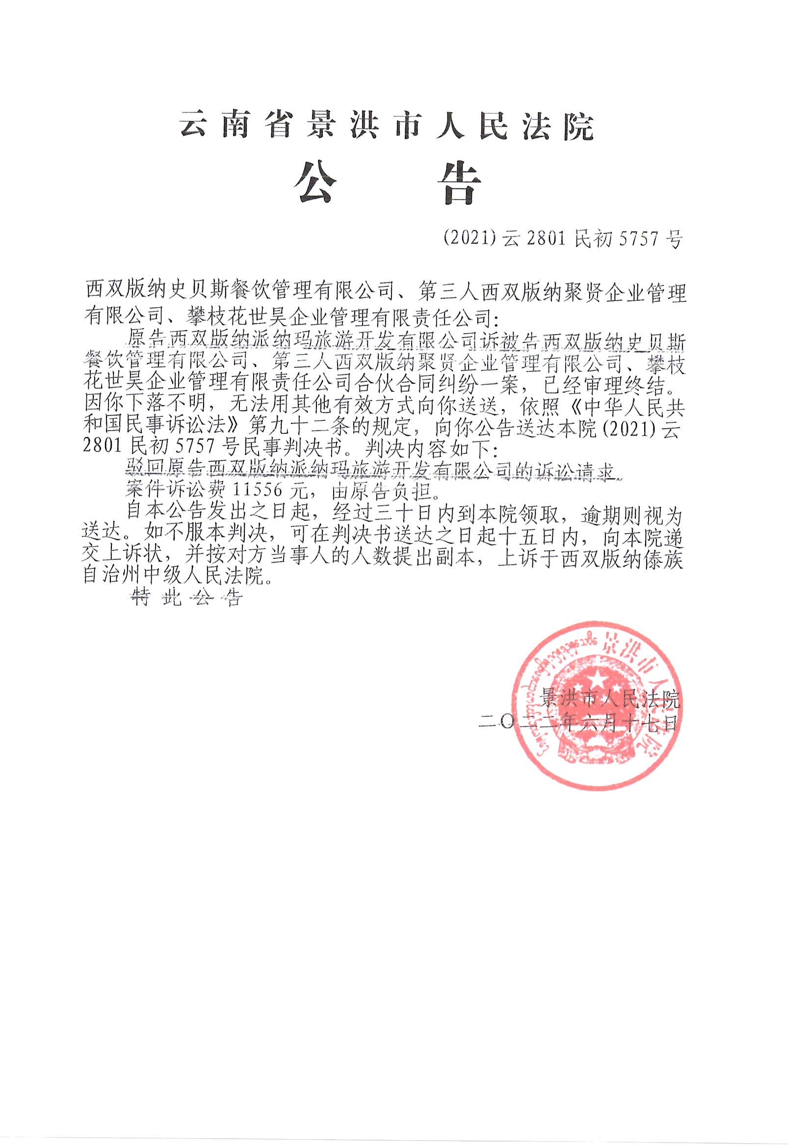 西双版纳史贝斯餐饮管理有限公司、第三人西双版纳聚贤企业管理有限公司、第三人攀枝花世昊企业管理有限公司(判决公告)