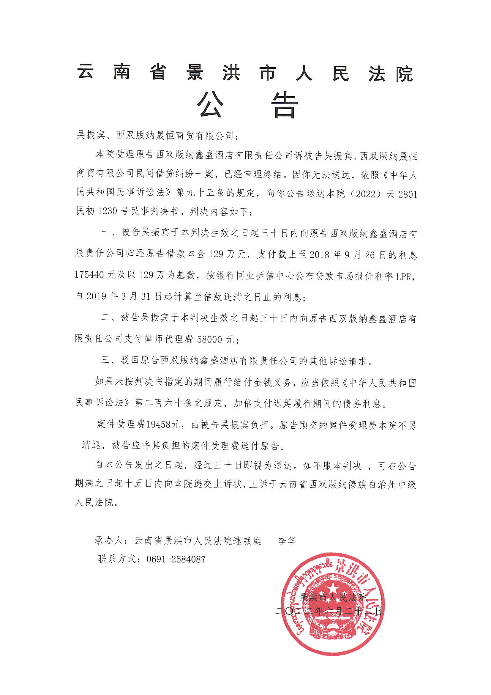 吴振宾、西双版纳晟恒商贸有限公司(判决公告)