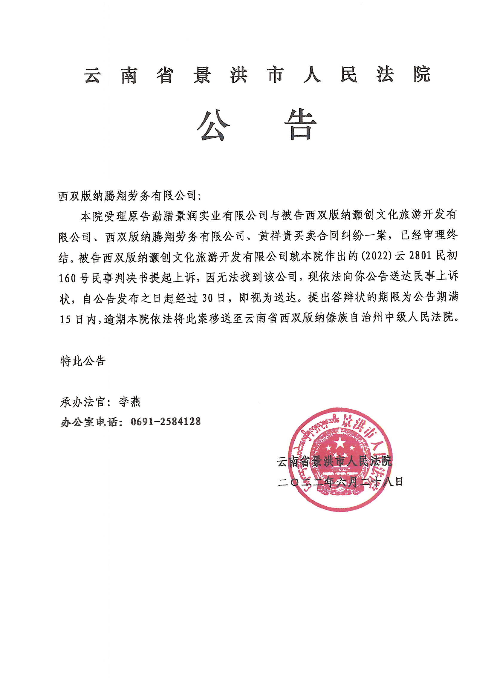 西双版纳腾翔劳务有限公司(公告上诉状)
