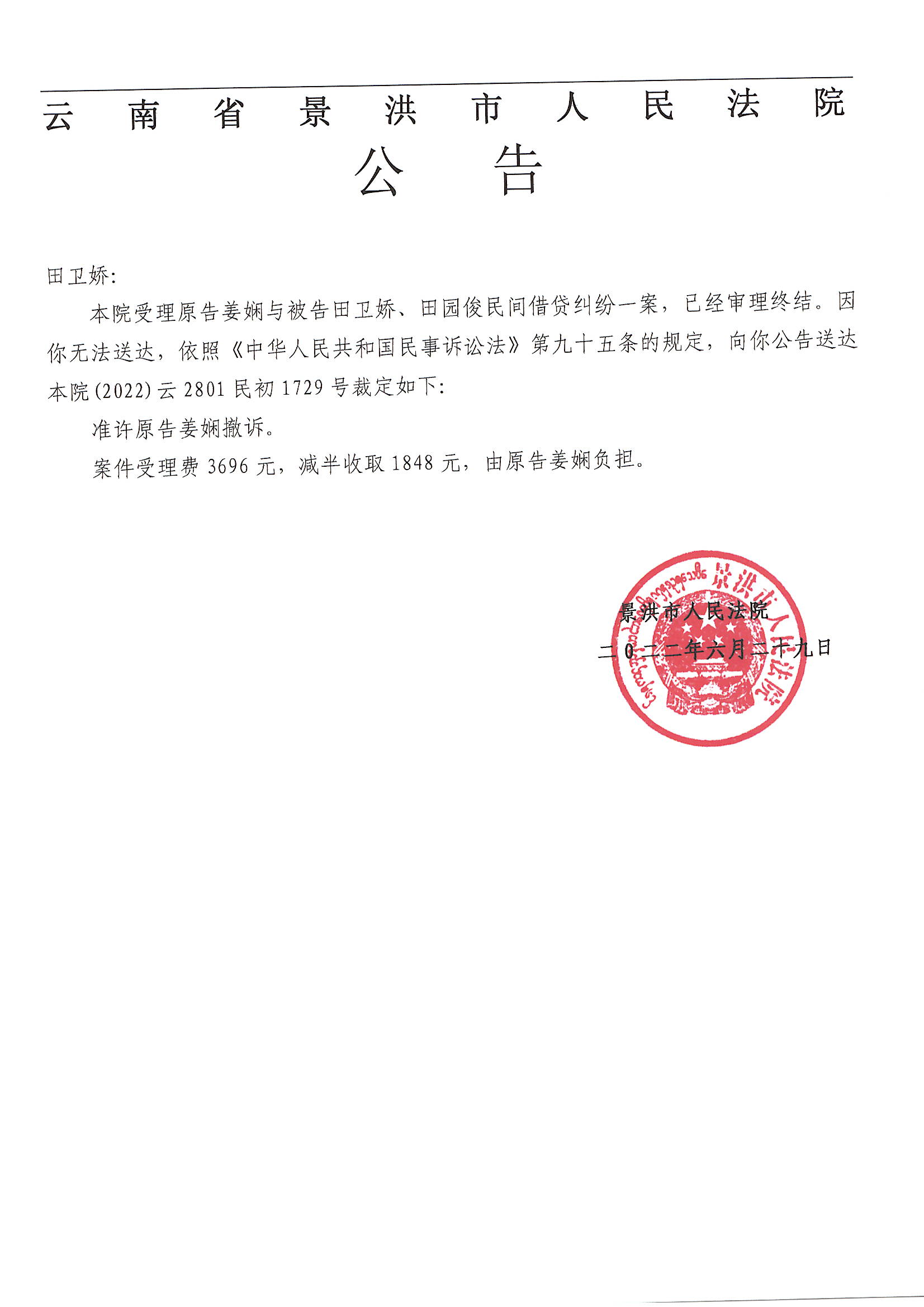 田卫娇(裁定公告)