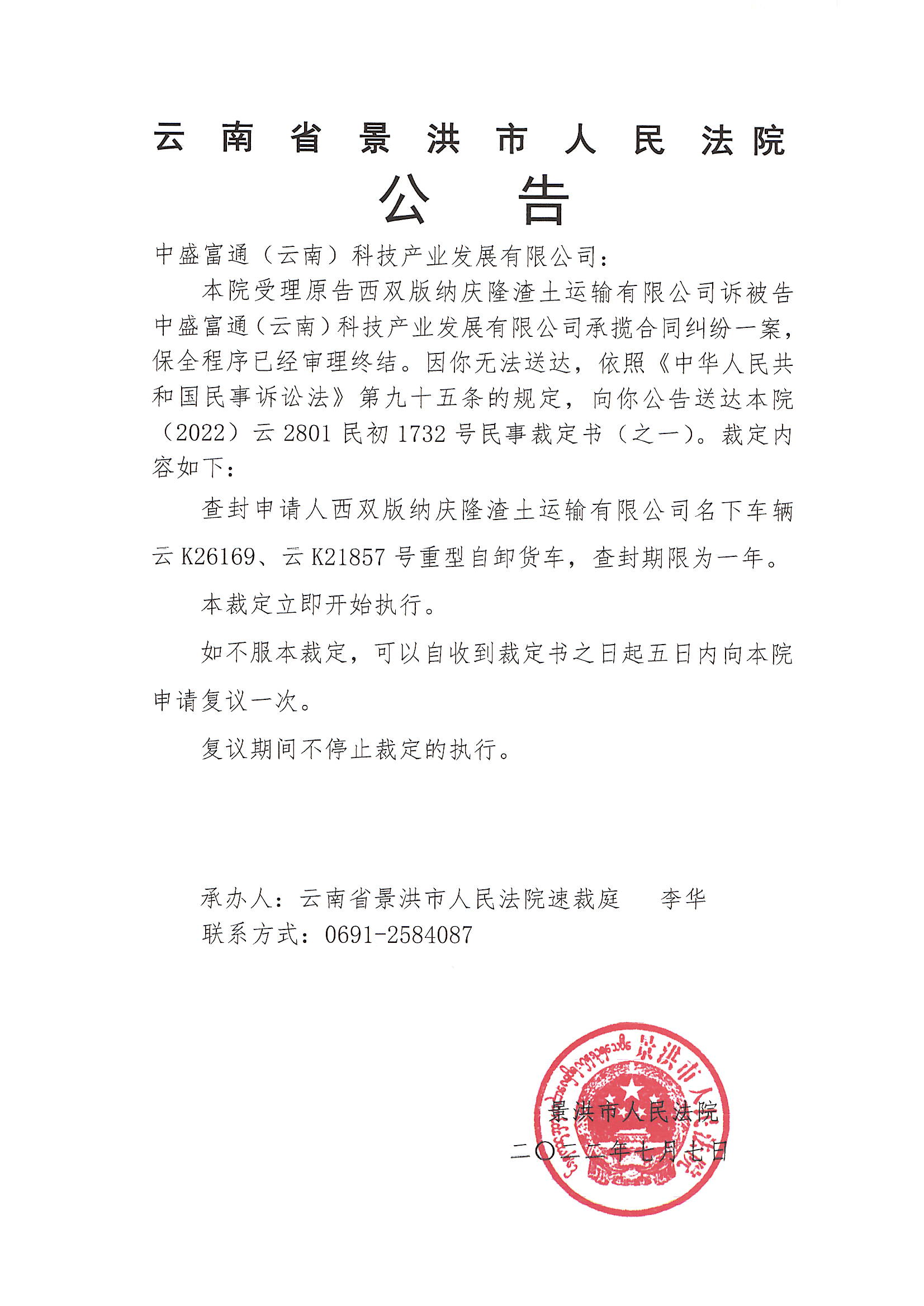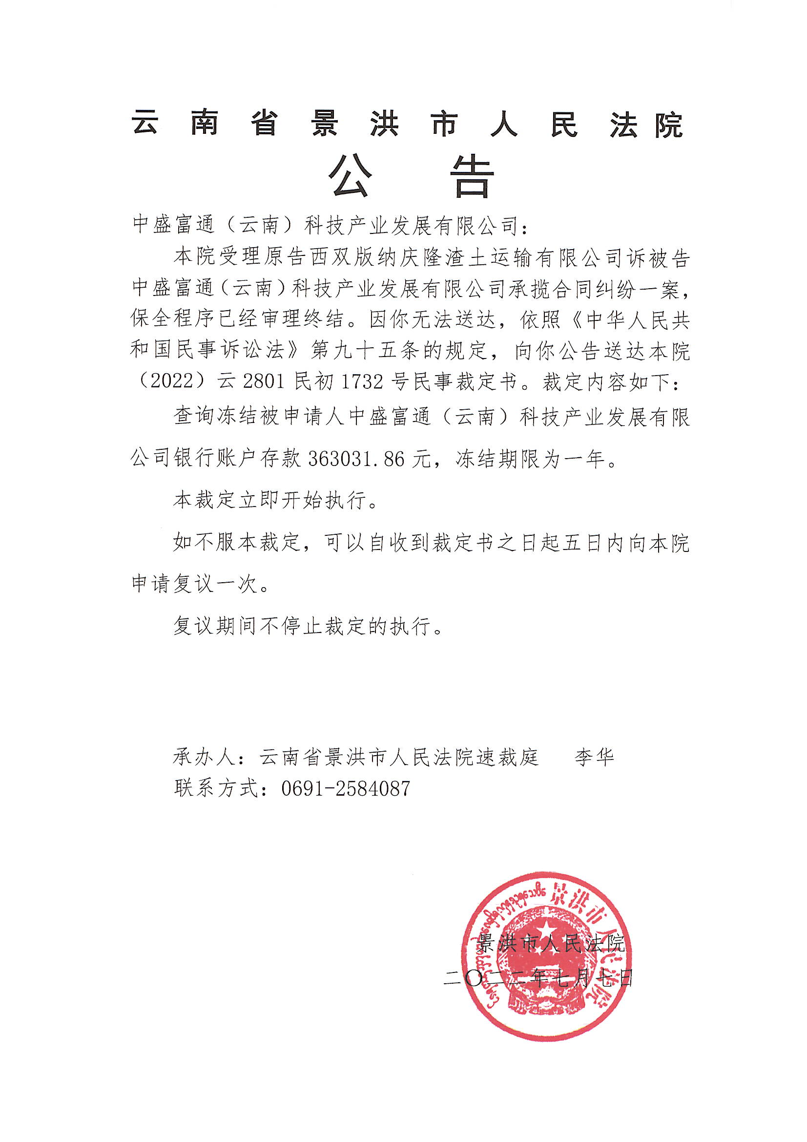 中盛富通(云南)科技产业发展有限公司(保全裁定公告*2)