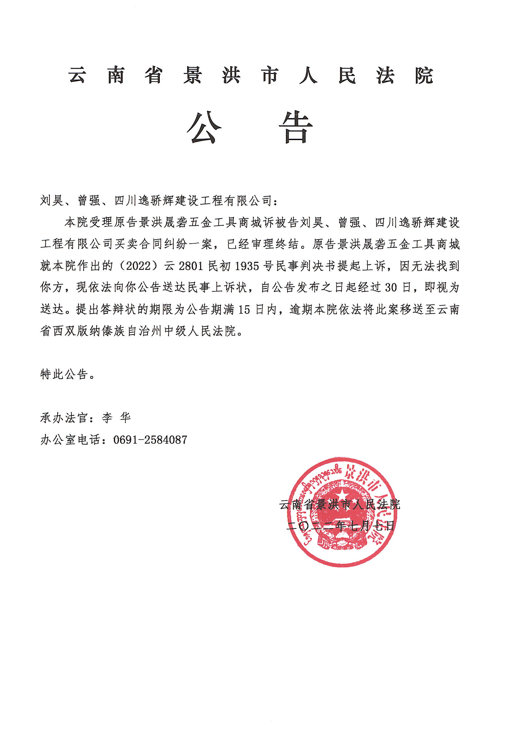 刘昊、曾强、四川逸骄辉建设工程有限公司(上诉状公告)