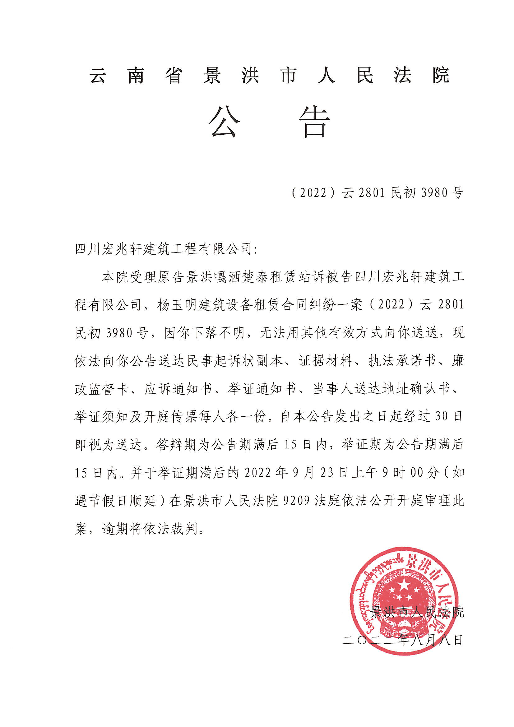 四川宏兆轩建筑工程有限公司(开庭公告)