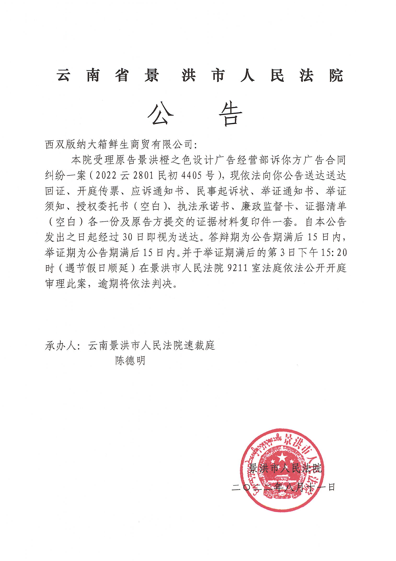西双版纳大箱鲜生商贸有限公司(传票公告)