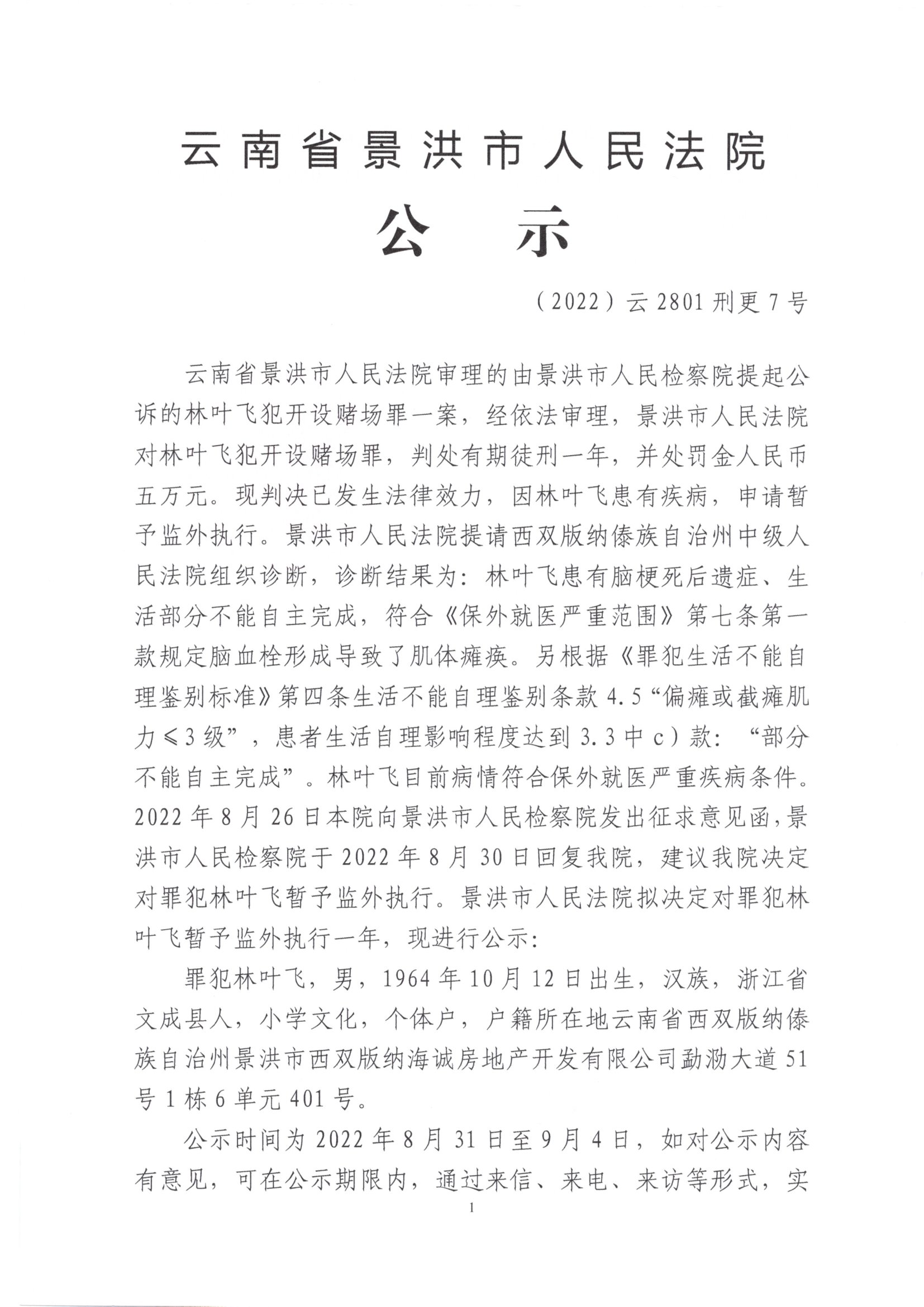 罪犯林叶飞犯开设赌场罪(暂予监外执行)