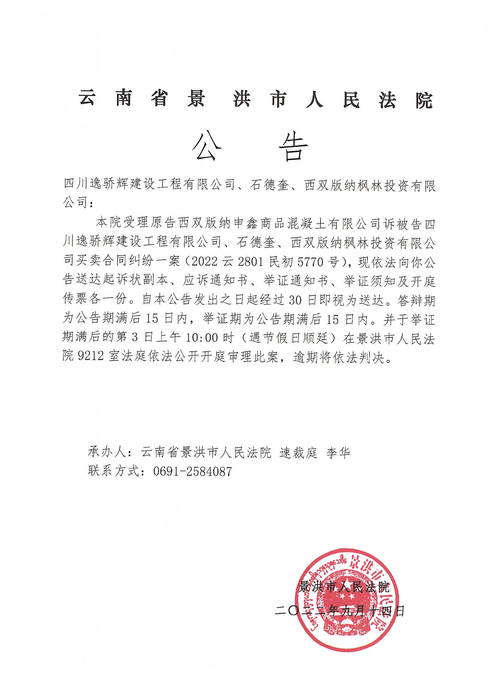 四川逸骄辉建设工程有限公司、石德奎、西双版纳枫林投资有限公司(传票公告)