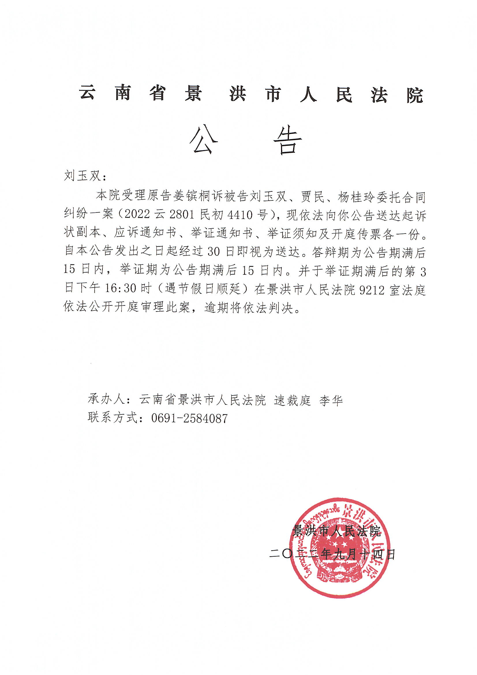 刘玉双(传票公告)