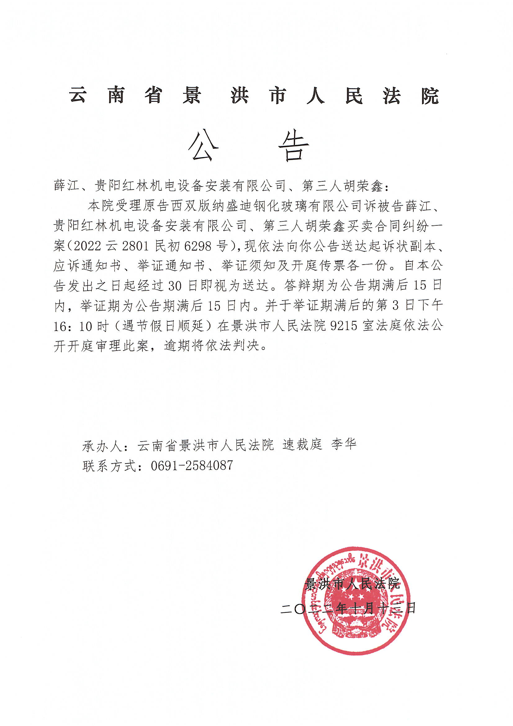 薛江、贵阳红林机电设备安装有限公司、第三人胡荣鑫(传票公告)