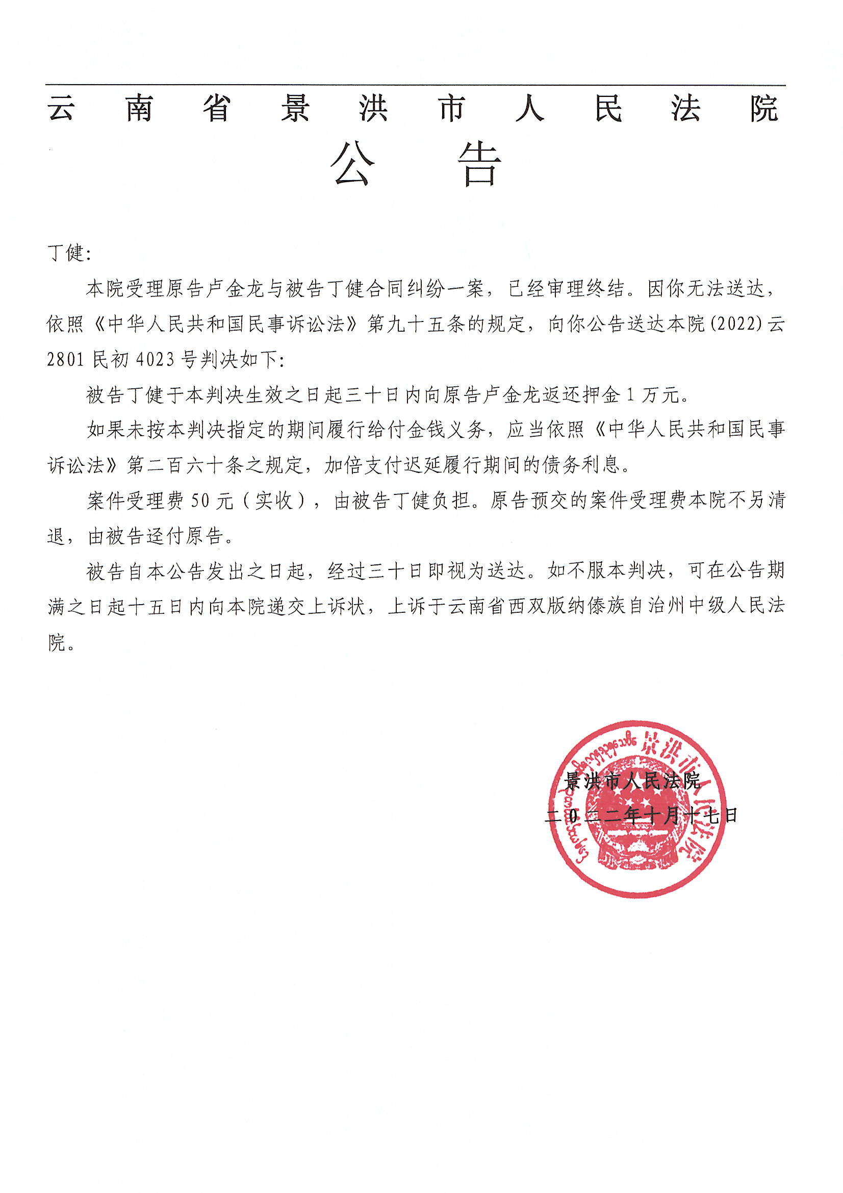 丁健(2022云2801民初4023号判决)