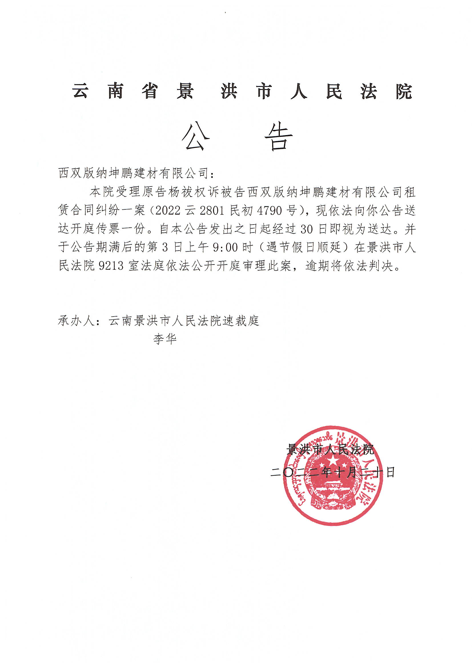 西双版纳坤鹏建材有限公司(改期传票公告)