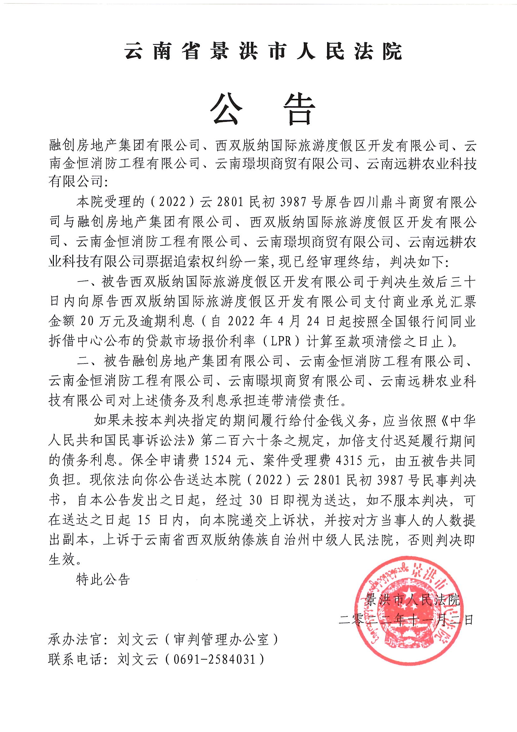 融创房地产集团有限公司、西双版纳国际旅游度假区开发有限公司、云南金恒消防工程有限公司、云南璟坝商贸有限公司、云南远耕农业科技有限公司(3987号)