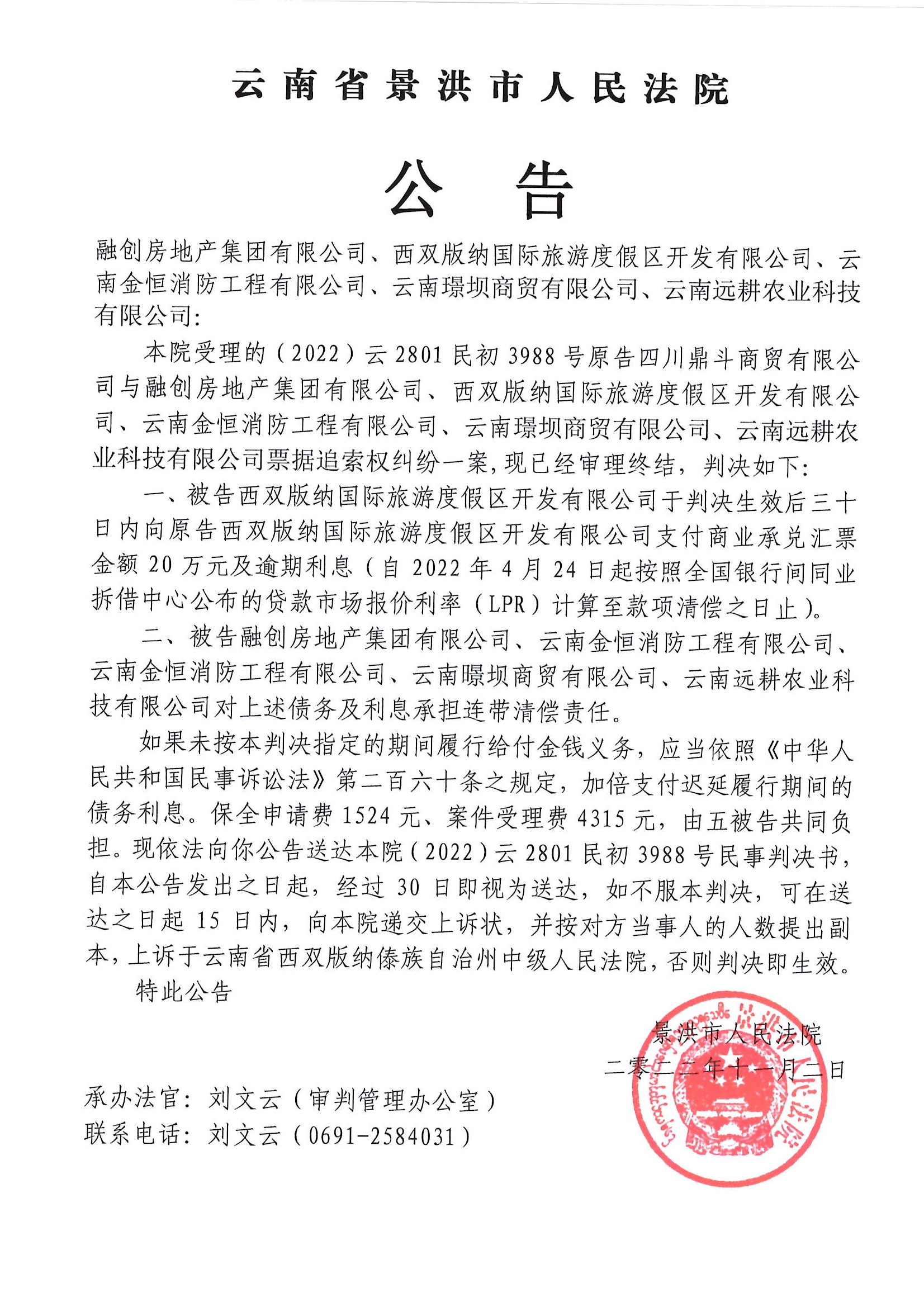 融创房地产集团有限公司、西双版纳国际旅游度假区开发有限公司、云南金恒消防工程有限公司、云南璟坝商贸有限公司、云南远耕农业科技有限公司(3988号)