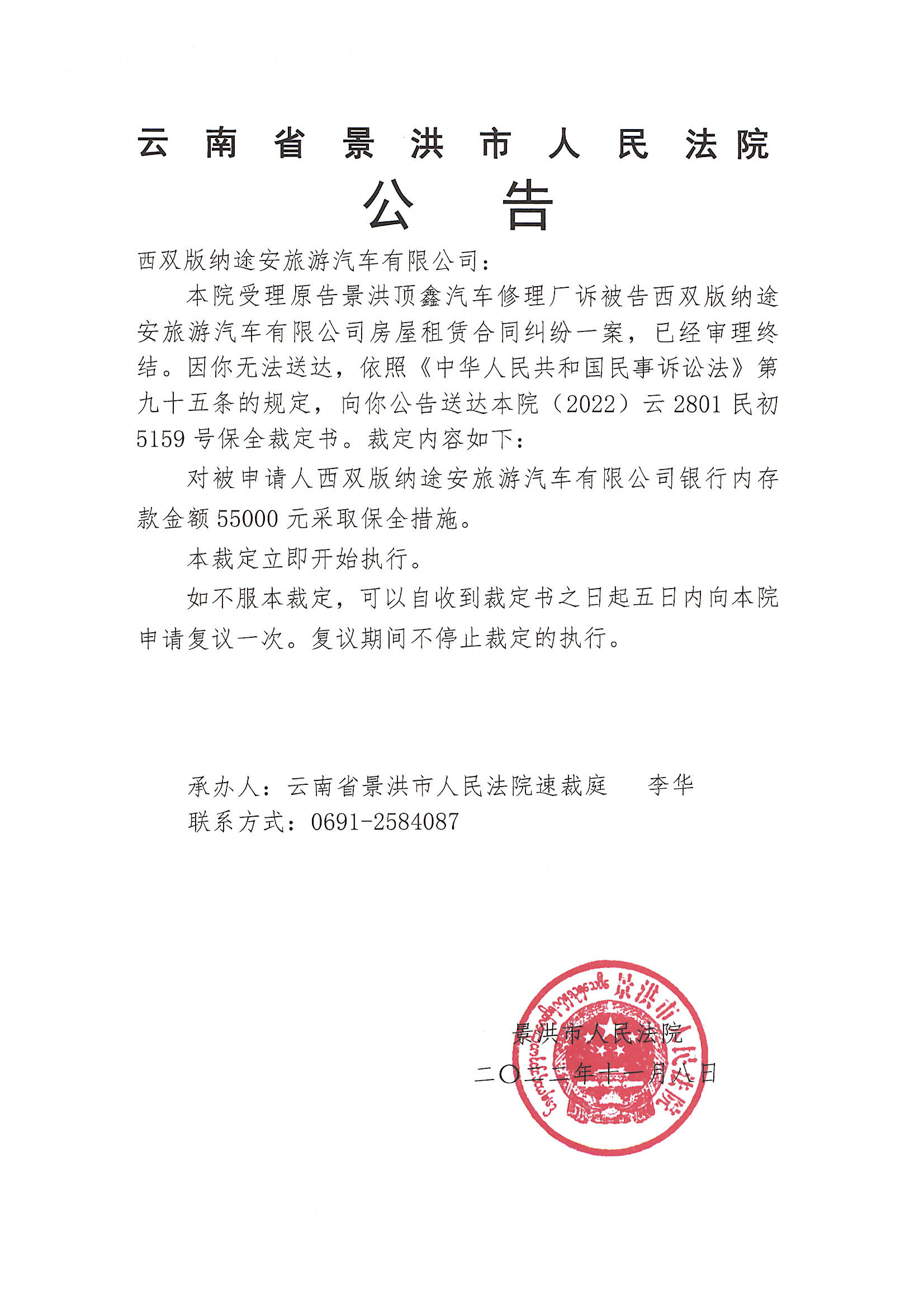 西双版纳途安旅游汽车有限公司(判决公告&保全裁定公告)