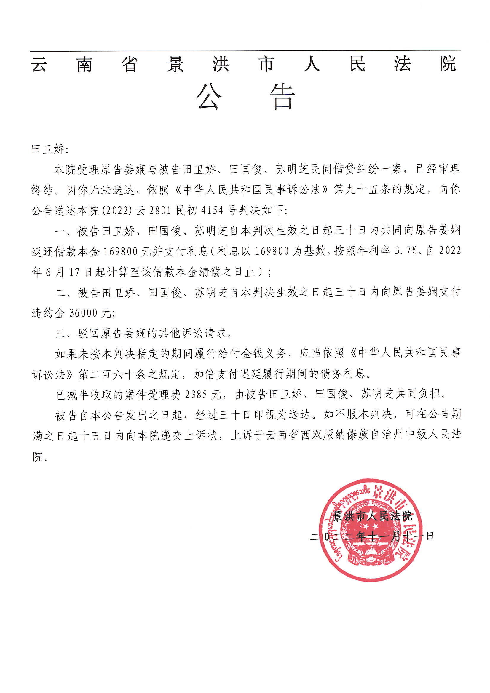 田卫娇(判决公告)