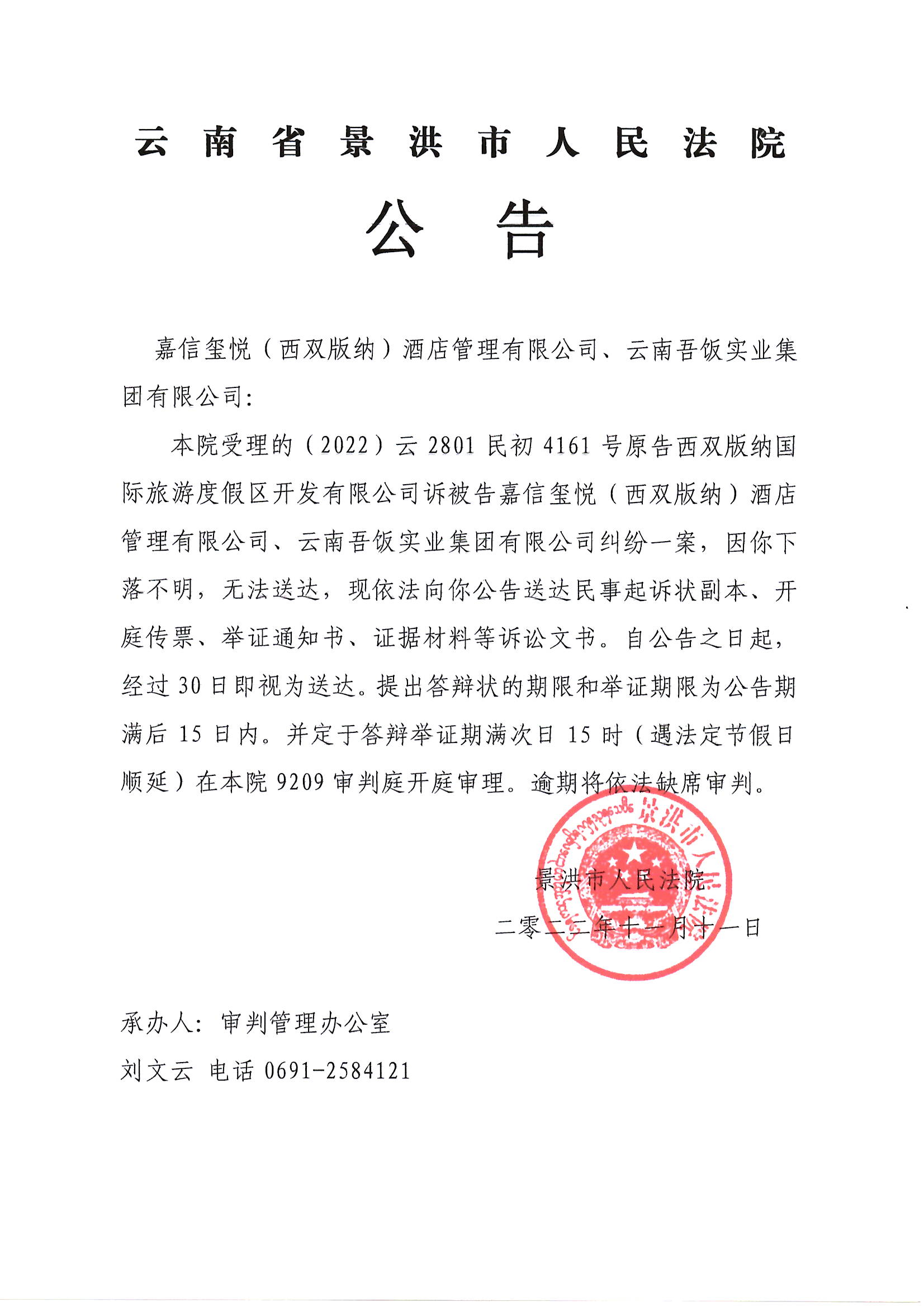嘉信玺悦(西双版纳)酒店管理有限公司、云南吾饭实业集团有限公司(开庭)